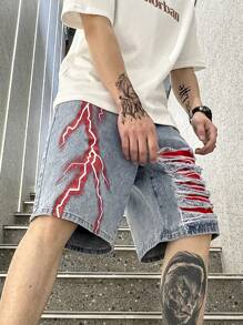 Zerrissene Herren Baumwolle Denim Shorts mit Blitz Print