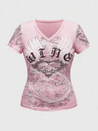ROMWE Avant Damen Große Größen Y2K-Stil ärmelloses Grafik-Shirt mit Kreuz-Strass-Verzierung