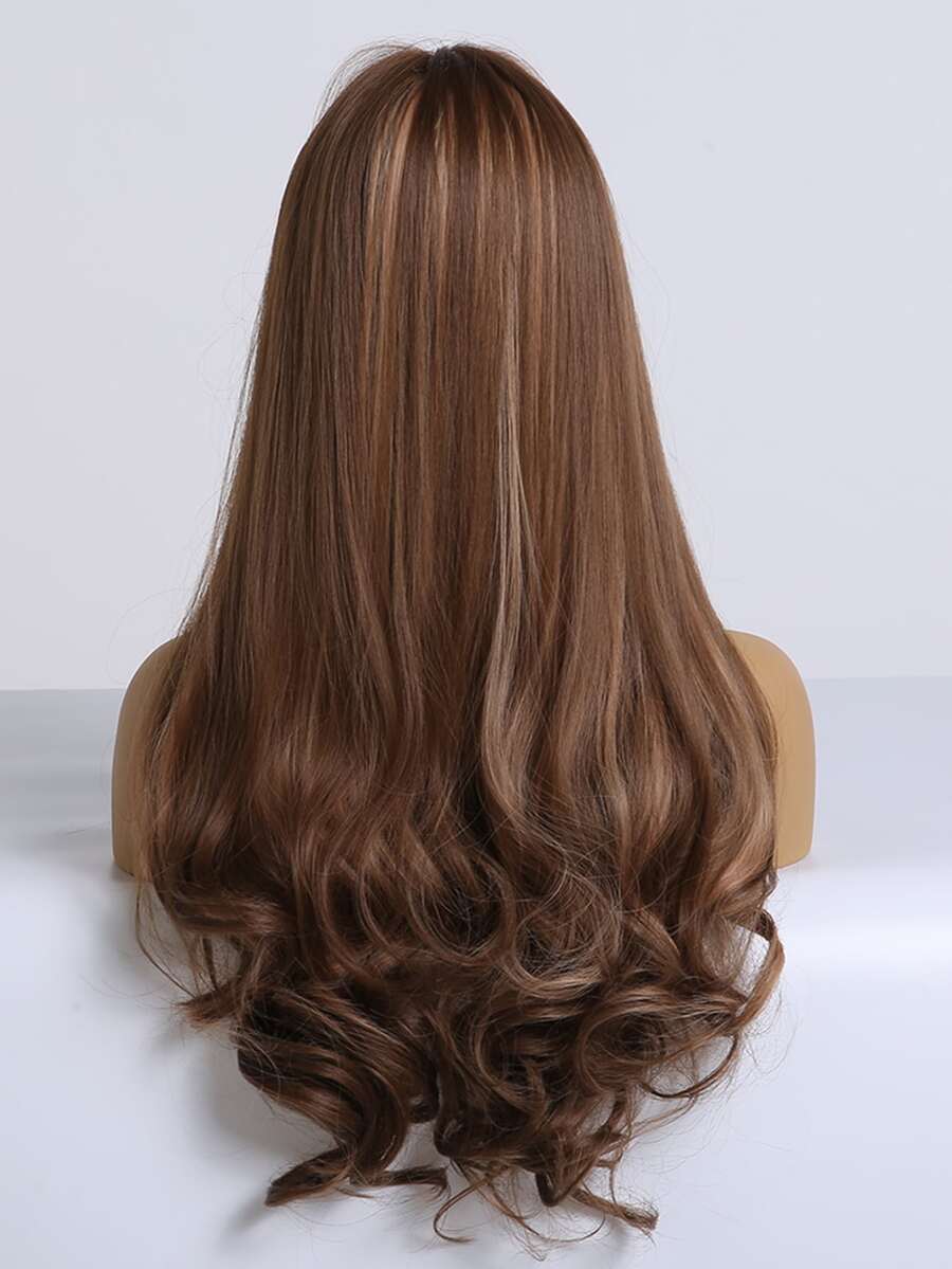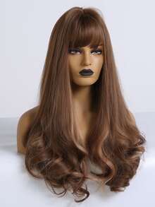 HAIRCUBE 28 Zoll lange lockige Perücken mit Pony, braune Highlight wellige Perücken für Frauen, synthetische Perücken für Mädchen zur täglichen Verwendung und für Partys, Cosplay