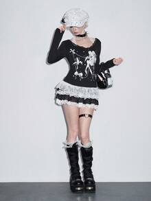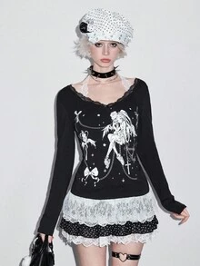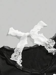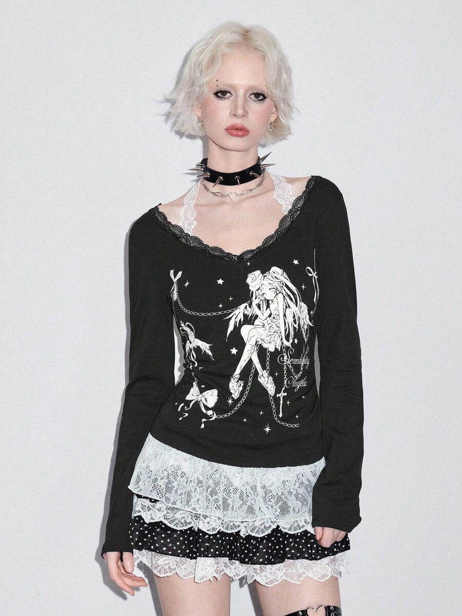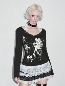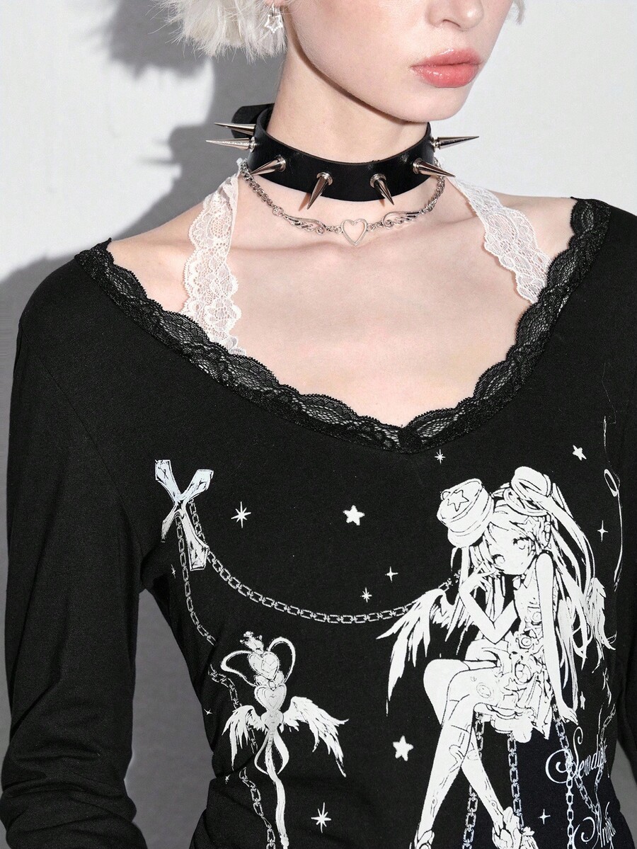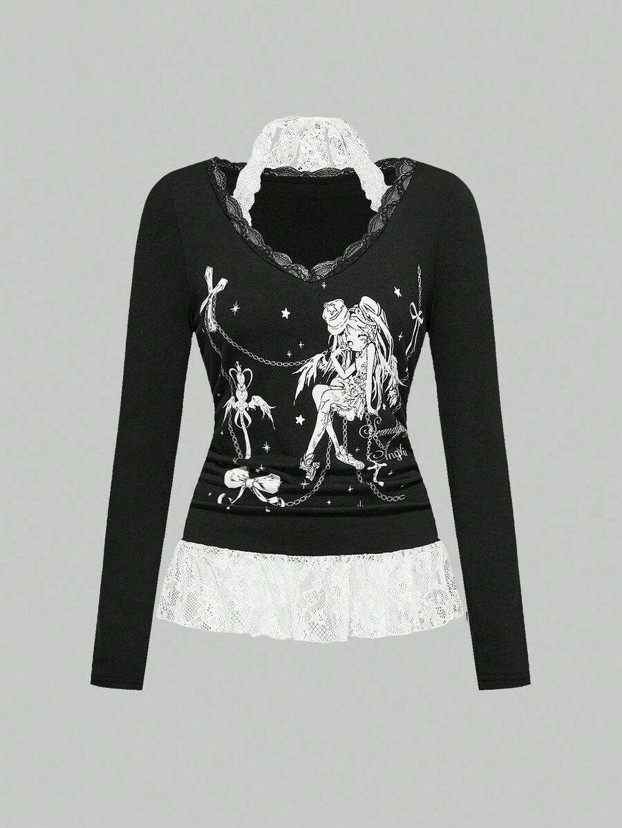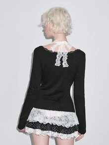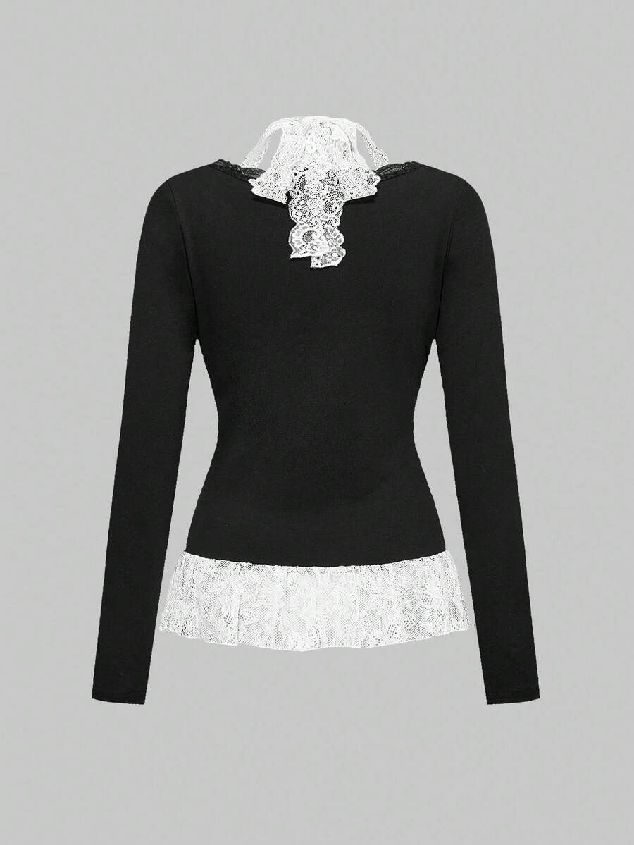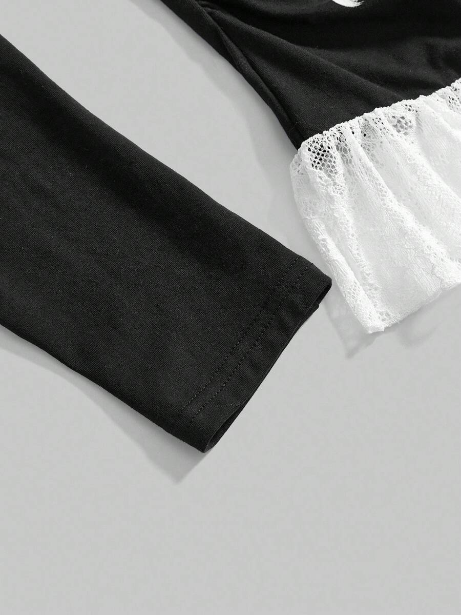 Halloween Anime Dunkel Kreuz & Schleife Kontrast Spitze Langarm T-Shirt (beinhaltet Spitzen-Trägerhemd und Spitzen-Saum Patchwork)