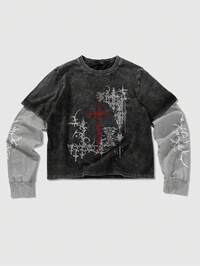 Goth Herren 2-in-1 Totenkopf Muster Y2K T-Shirt, Schule, Herbst, 2000er Jahre Stil, Langarm Oberteil