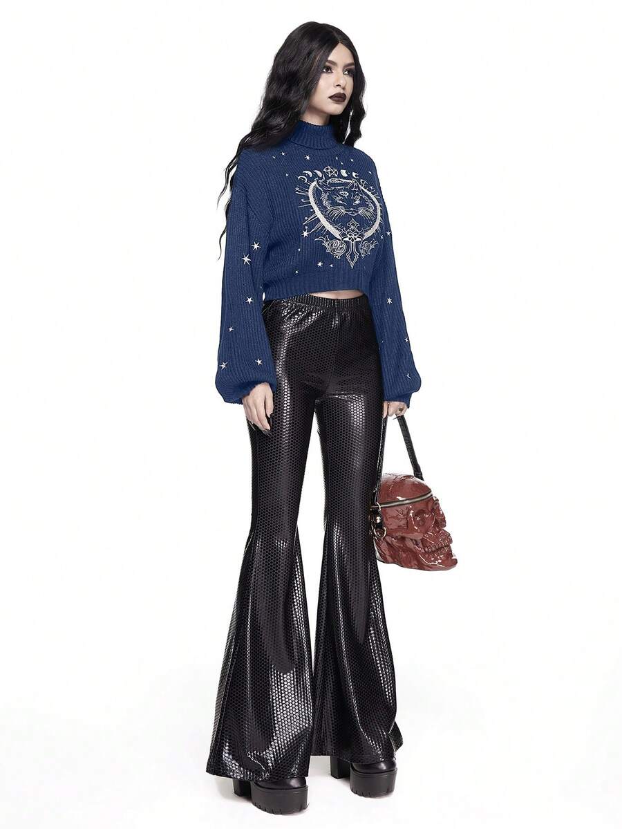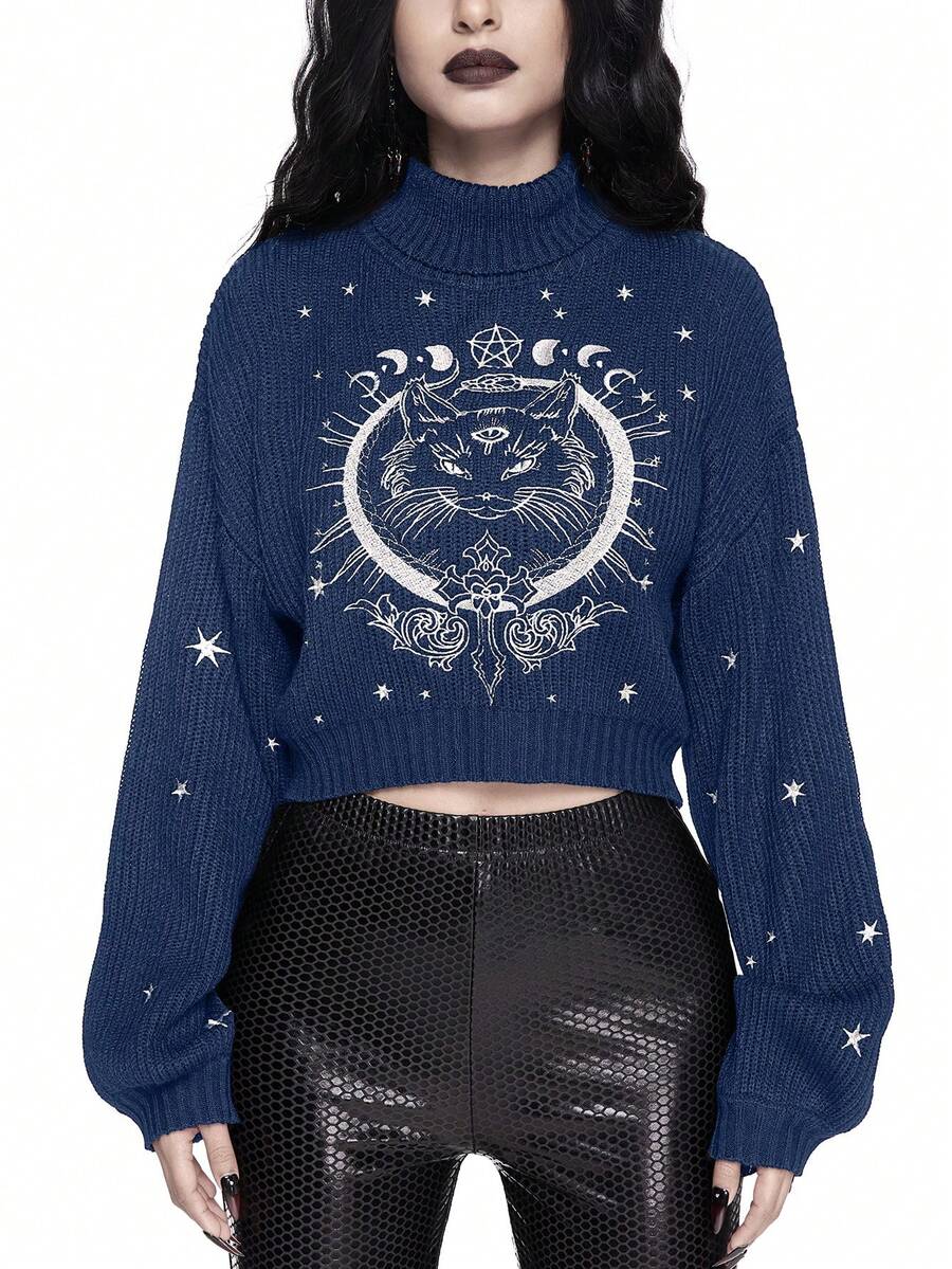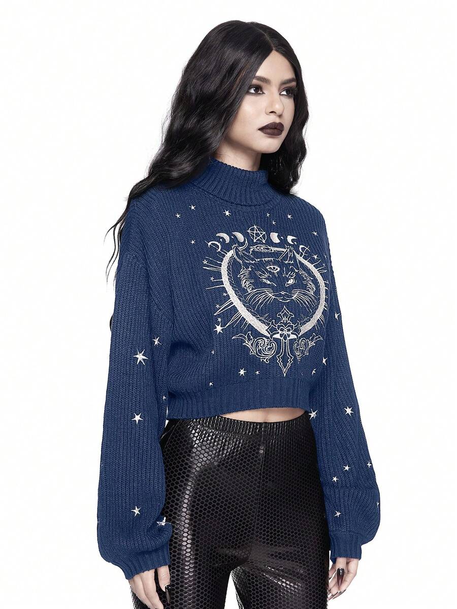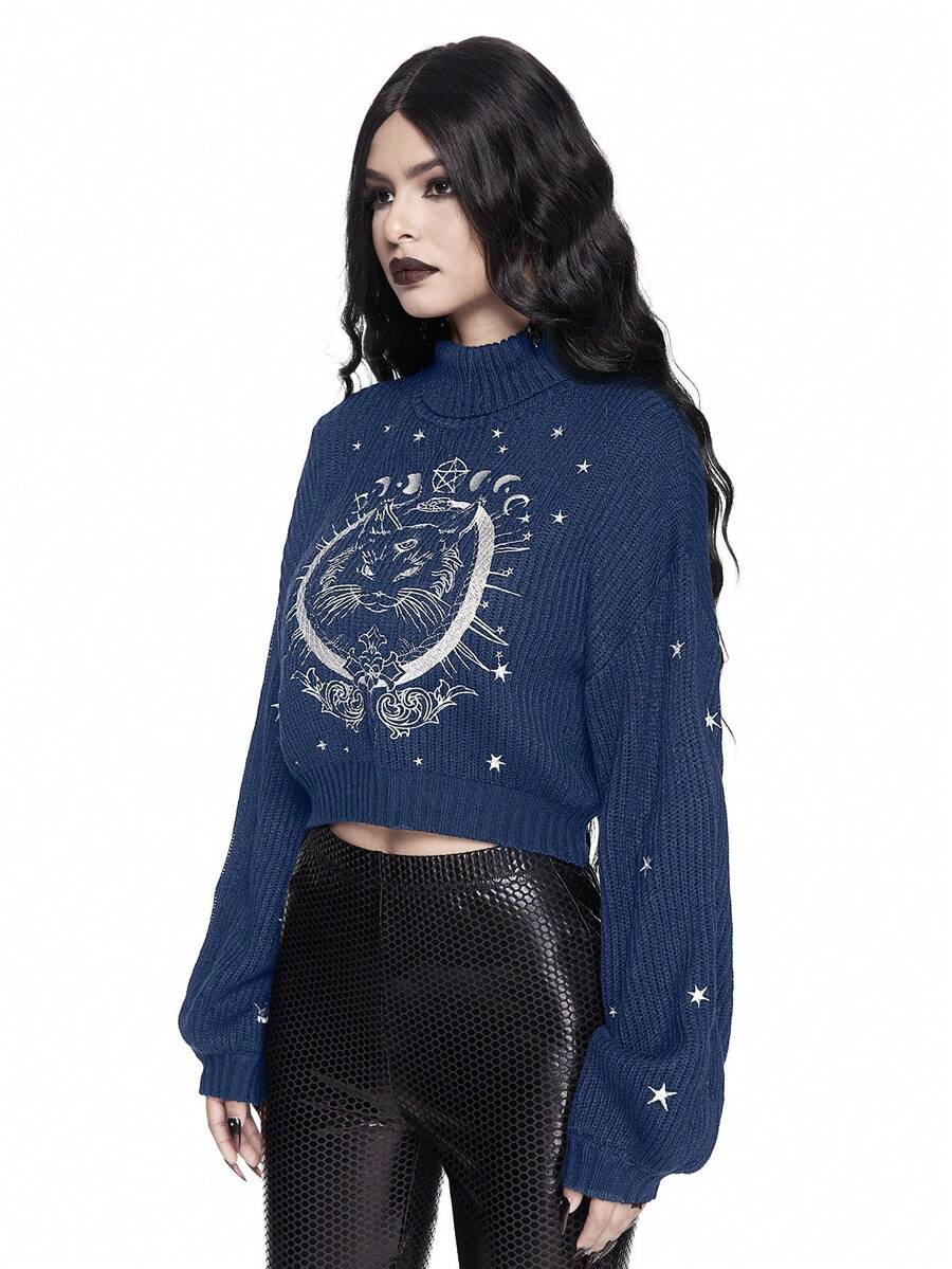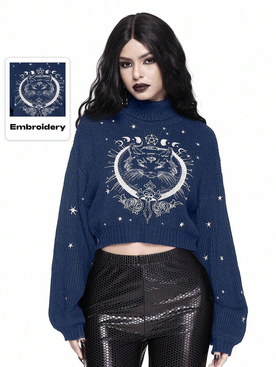 Goth Hochgeschlossener, dunkel-gotischer, schwarzer, mysteriöser Pullover mit Katzen-Stickerei