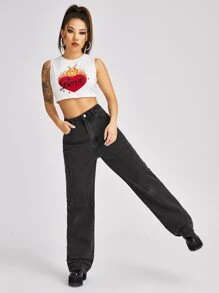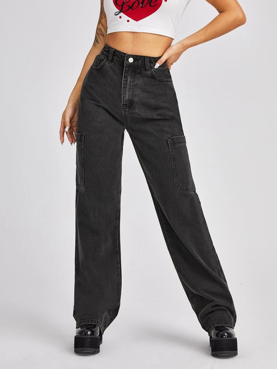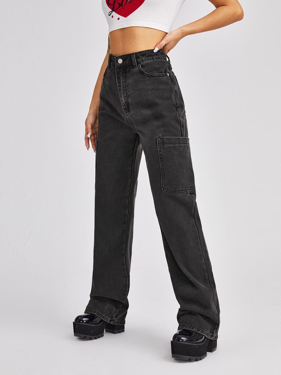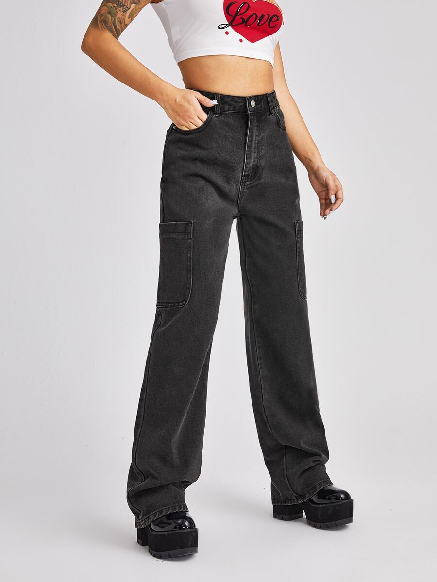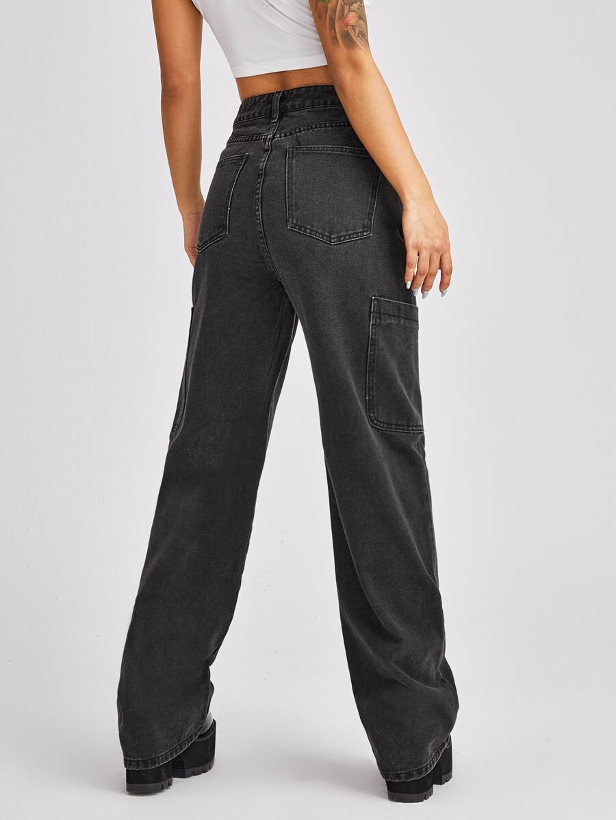 Jeans mit hoher Taille, Taschen Flicken und weitem Beinschnitt