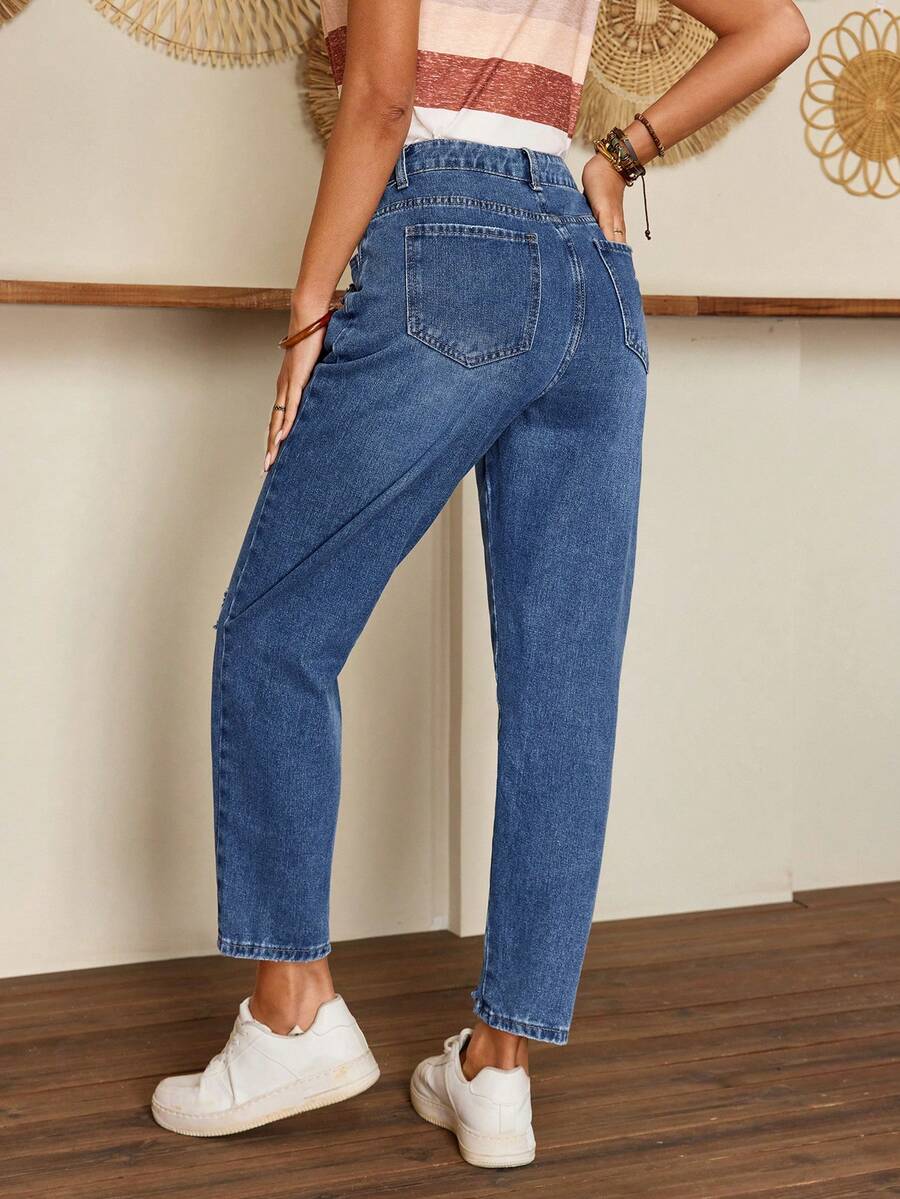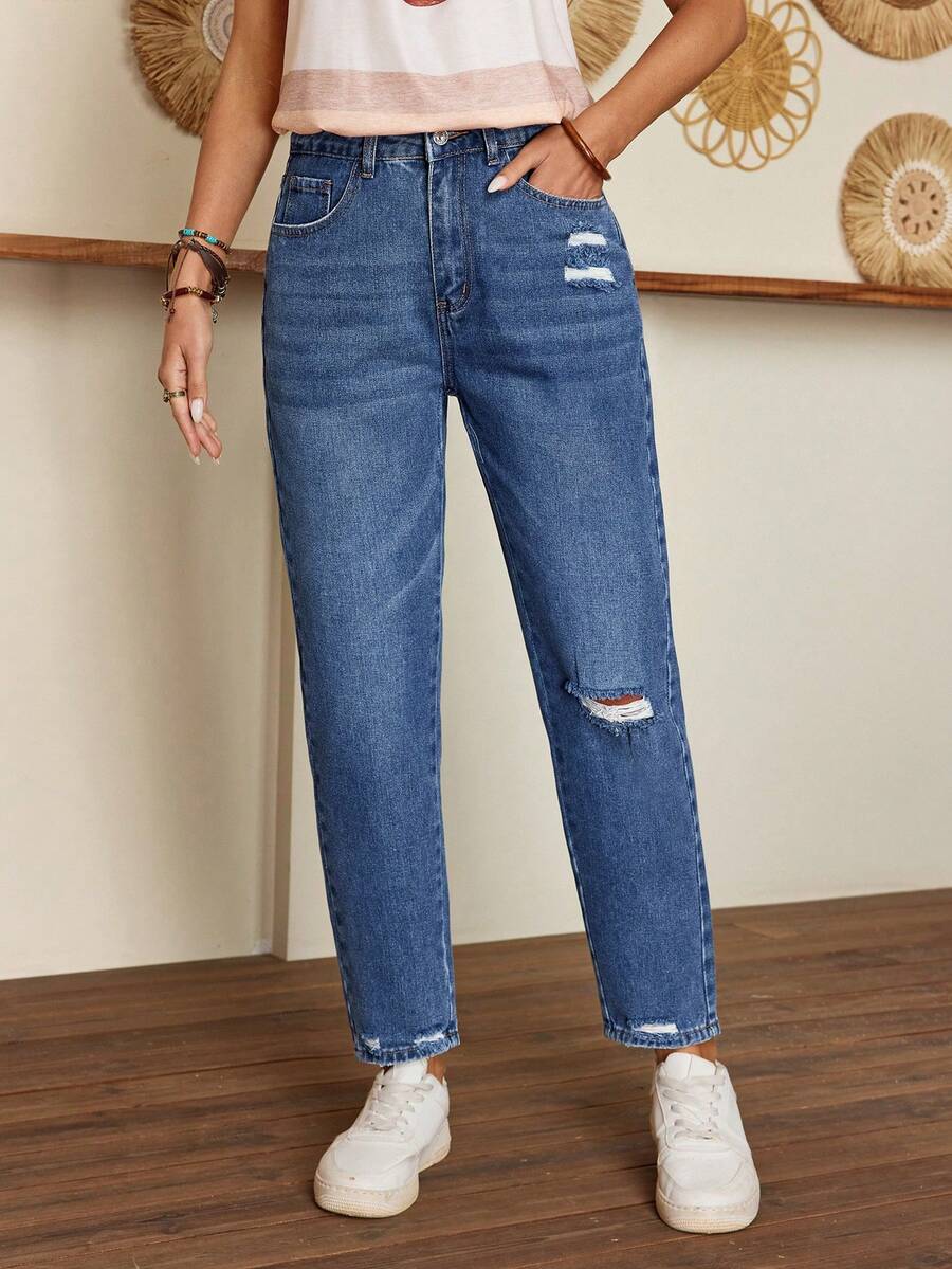Mom Jeans mit hoher Taille, Riss, ausgefranstem Saum