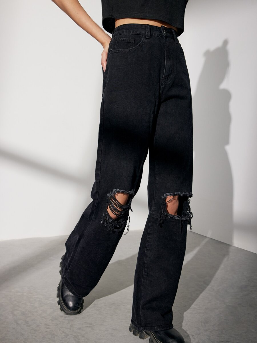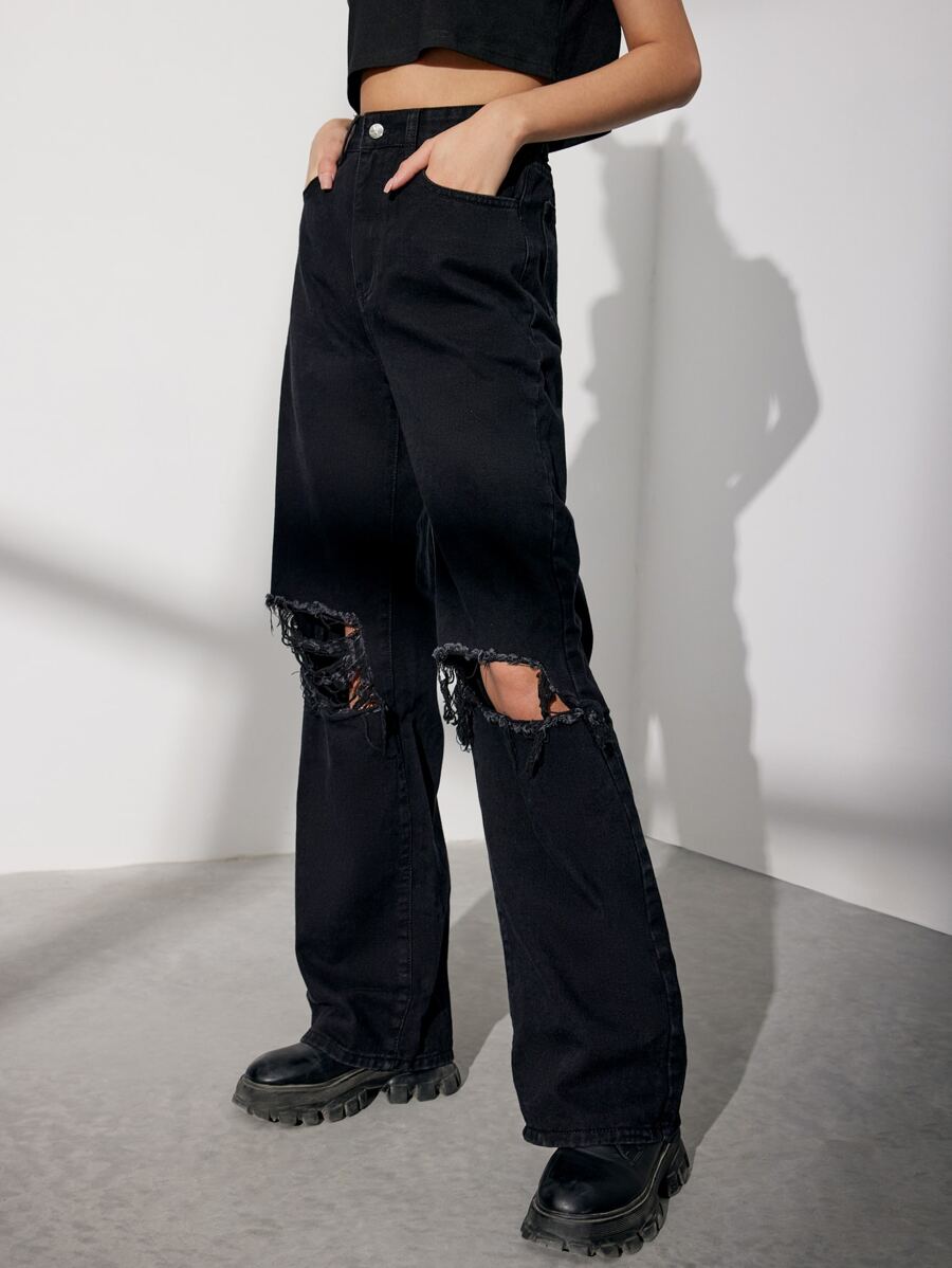 Jeans mit hoher Taille, Riss, breitem Beinschnitt