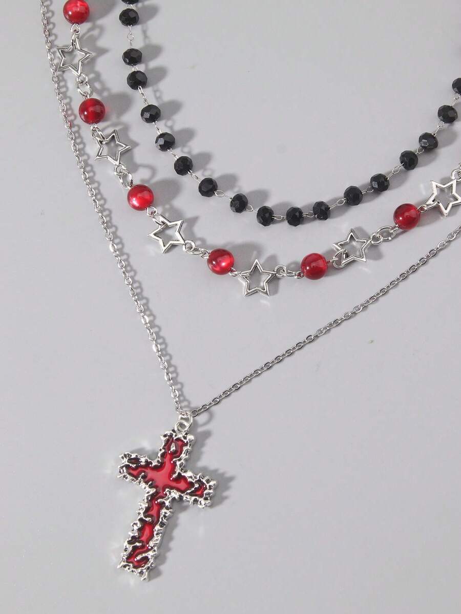 Hippie 3 Stücke/Set Gothic Mode rote Perlen, Sterne, kreatives Kreuz, Glas Kristall Schlüsselbein Kette, Schmuckset für Frauen