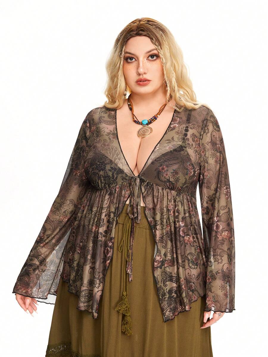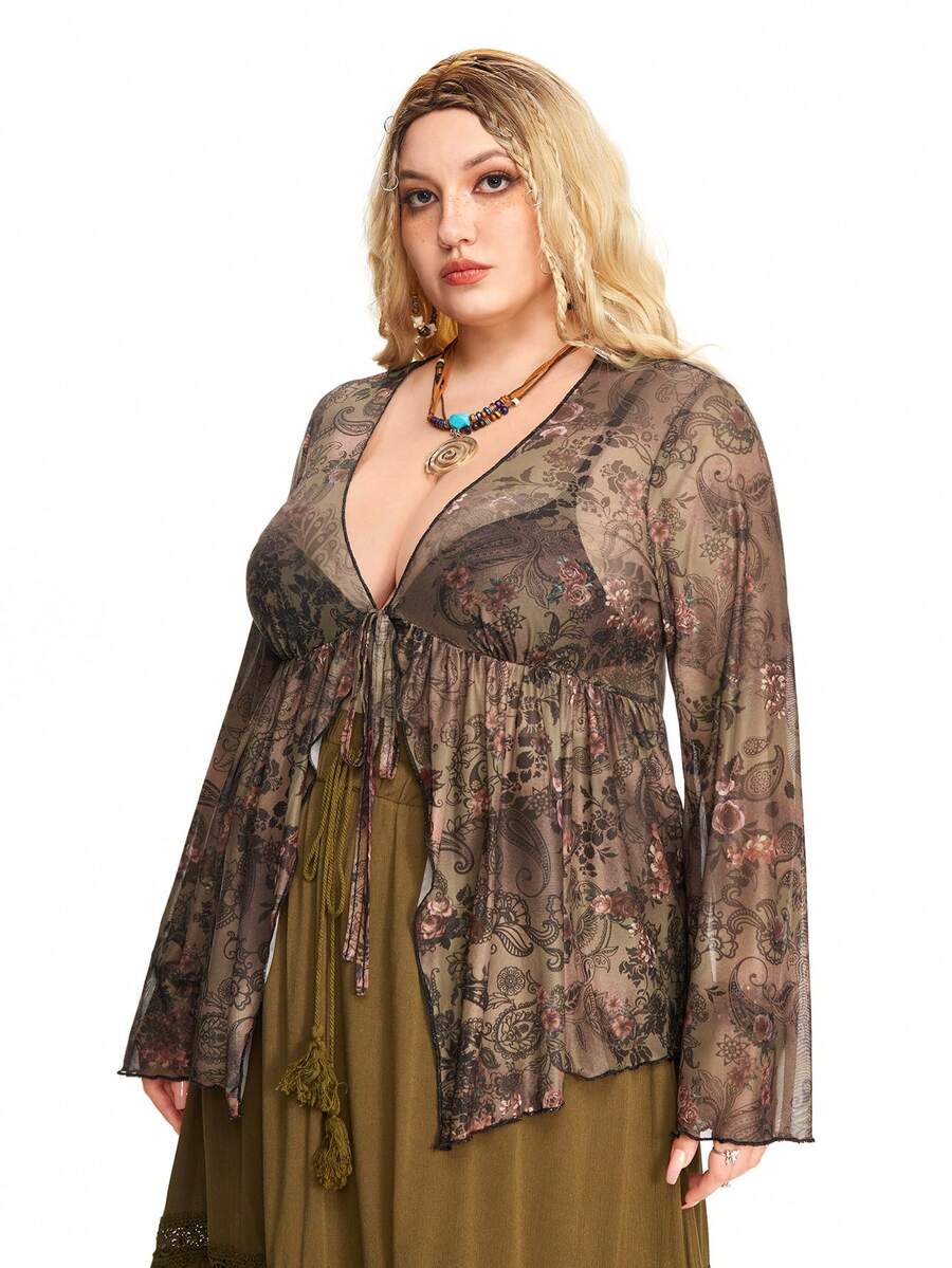 Hippie Überall bedrucktes Top mit Glockenärmeln für Damen in Große Größen