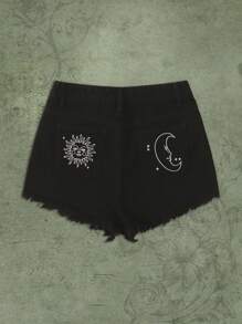 Hippie Denim Shorts mit Sonne & Mond Grafik umgesäumtem Saum,