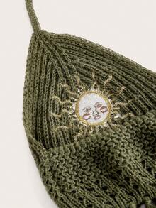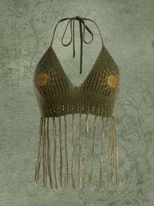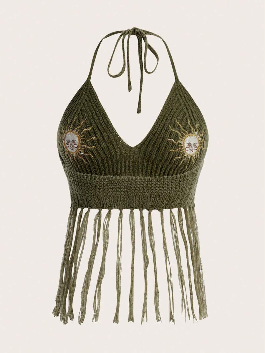 Hippie Strick Top mit Sonne Muster Fransen, Neckholder,
