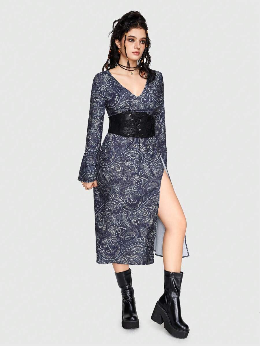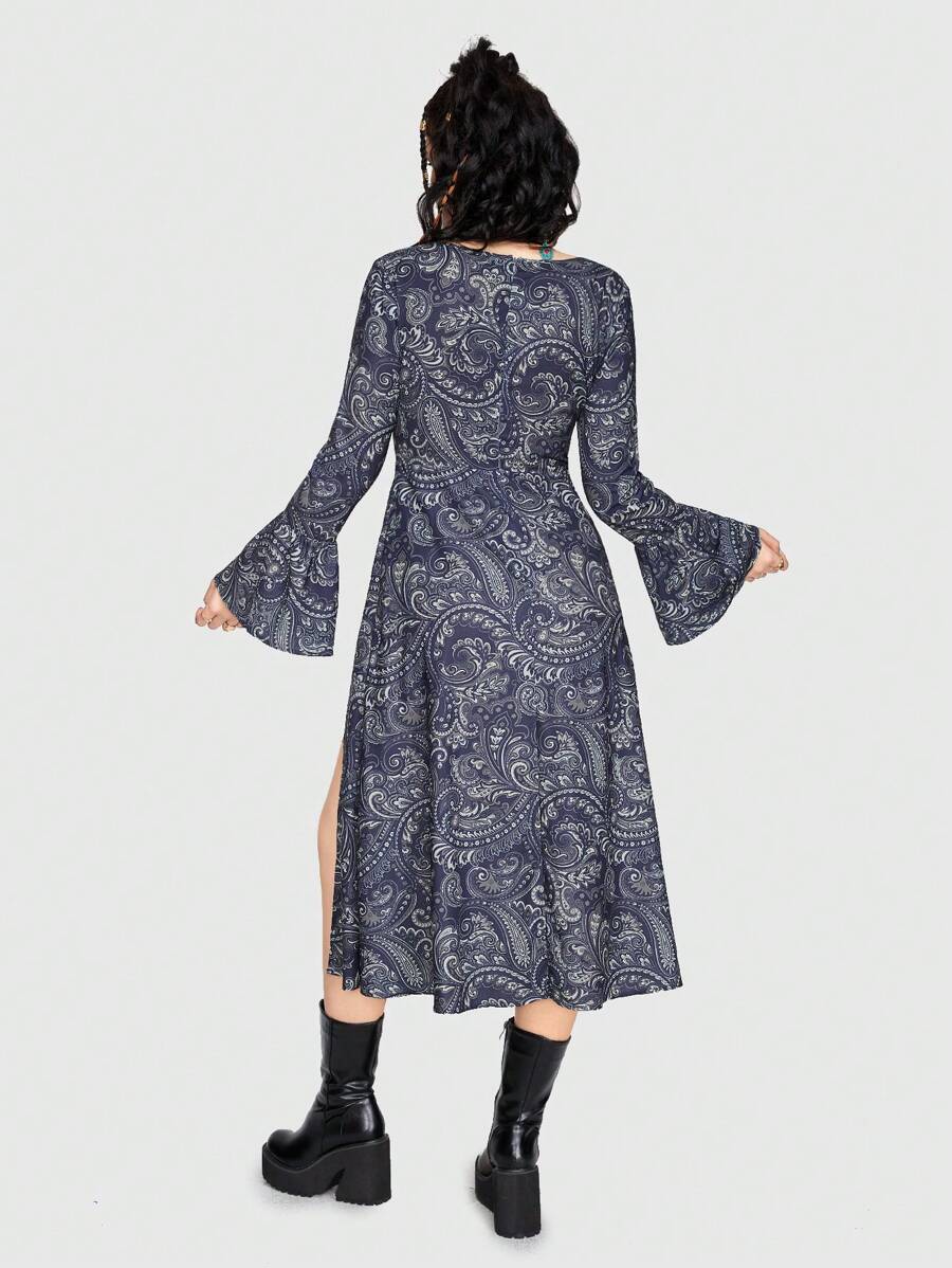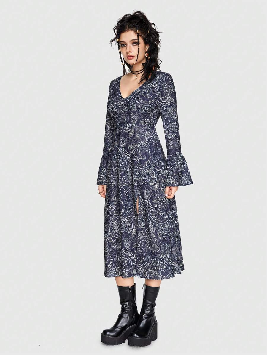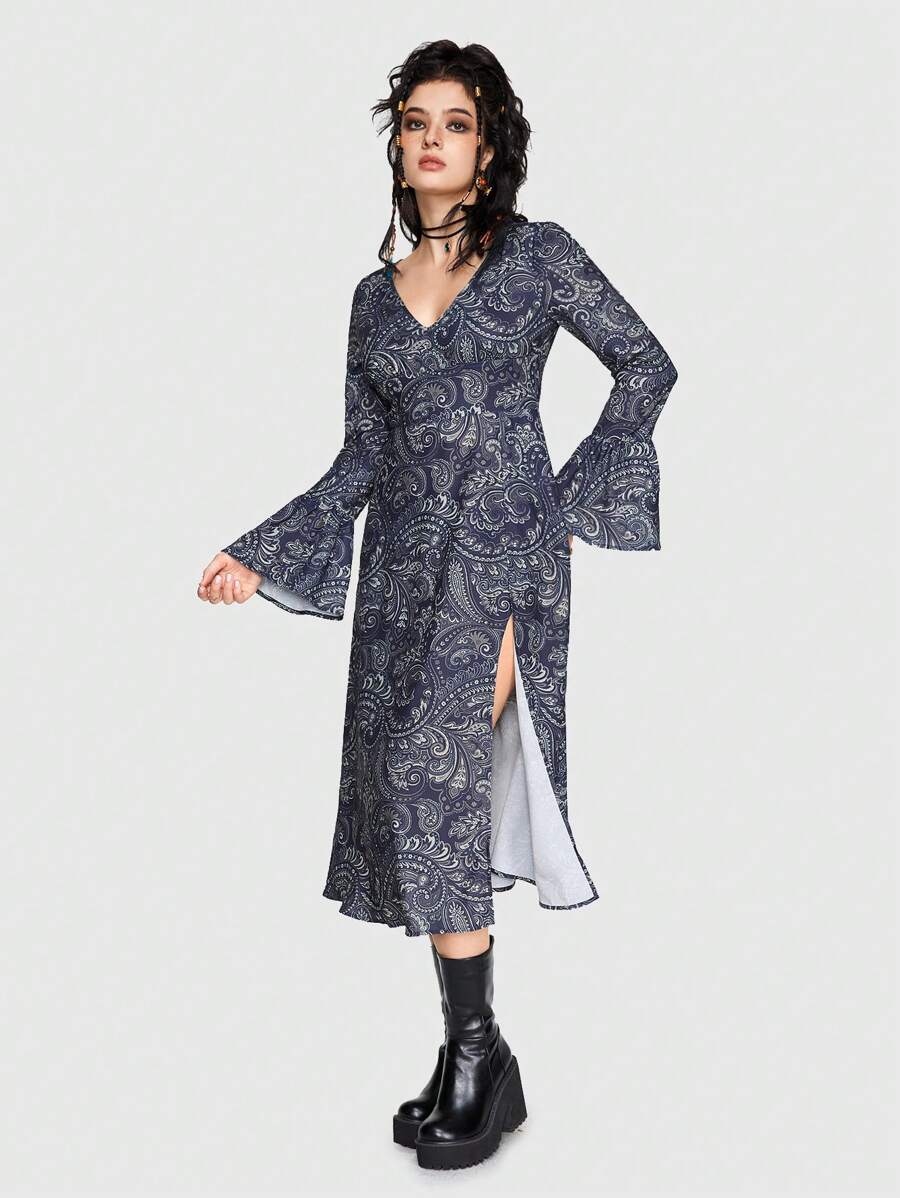 Hippie V-ausschnitt Paisley Druck Kleid Mit Hohem Seitlichem Schlitz