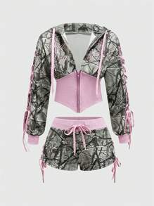 J-Fashion 2 Stücke Y2K Sexy taillierter Tarndruck & bestickter Text Damen Set