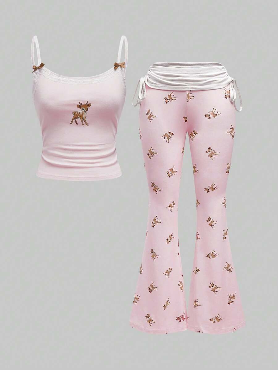 J-Fashion Süße Hirsch-bestickte Spitzenbluse kombiniert mit Hirsch-Allover-Muster Weite Hose