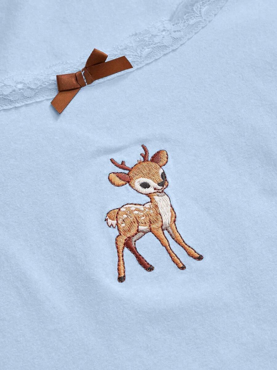 J-Fashion Süße Hirsch-bestickte Spitzenbluse kombiniert mit Hirsch-bedruckter Schlaghose, Herbst/Winter