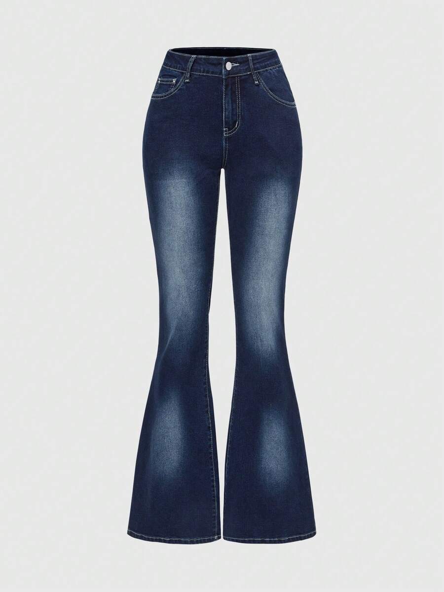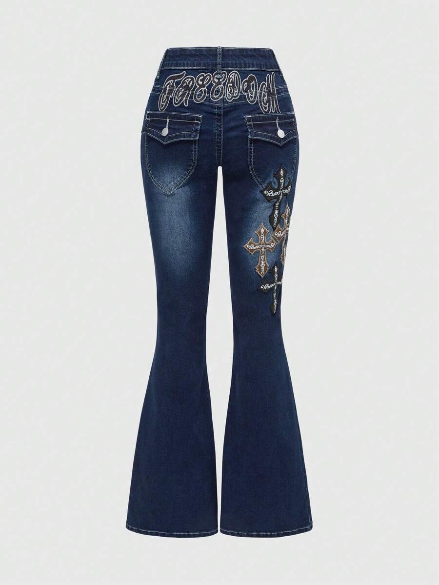 J-Fashion Damen Lässig Retro Kreuz & Buchstaben bestickte Schlagjeans