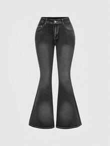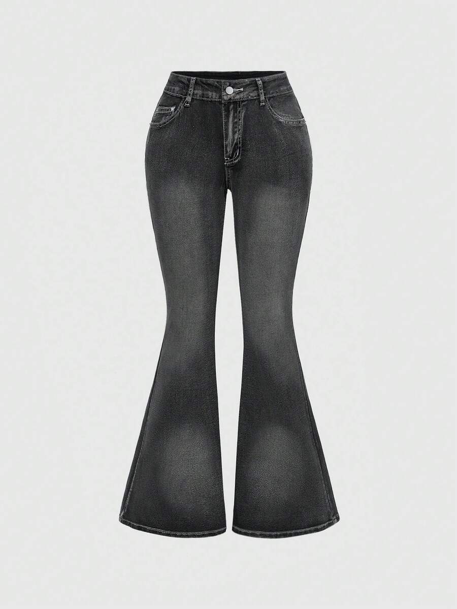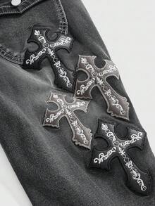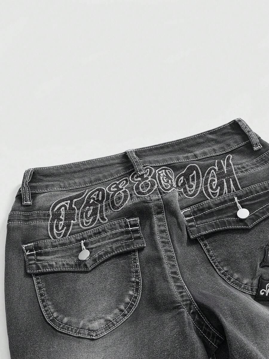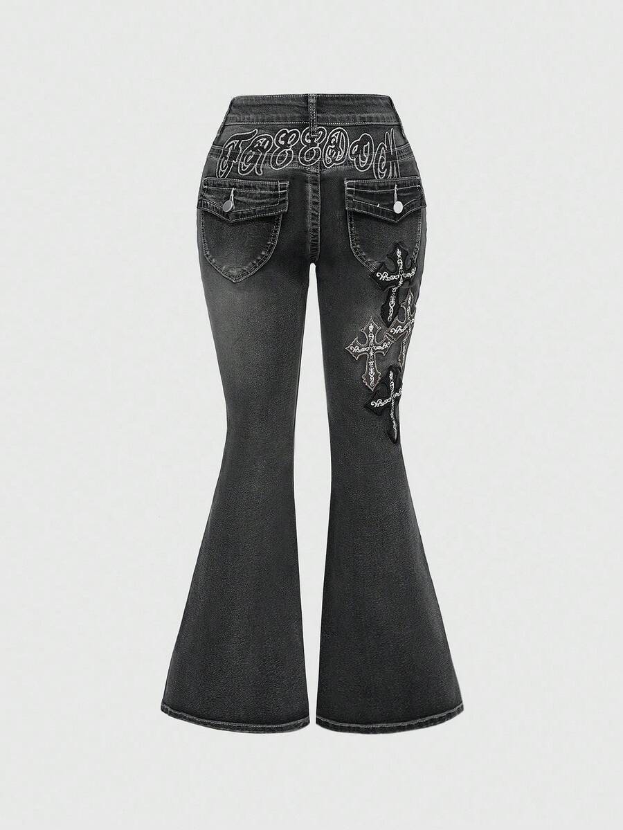 J-Fashion Damen Kreuz & Buchstaben bestickte Jeans mit extra tiefer Taille und Weitung