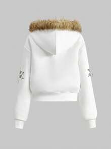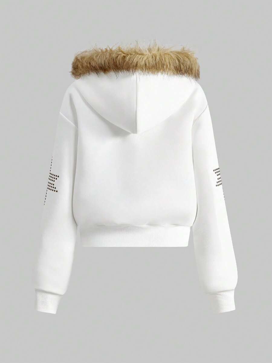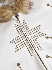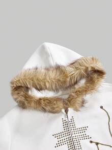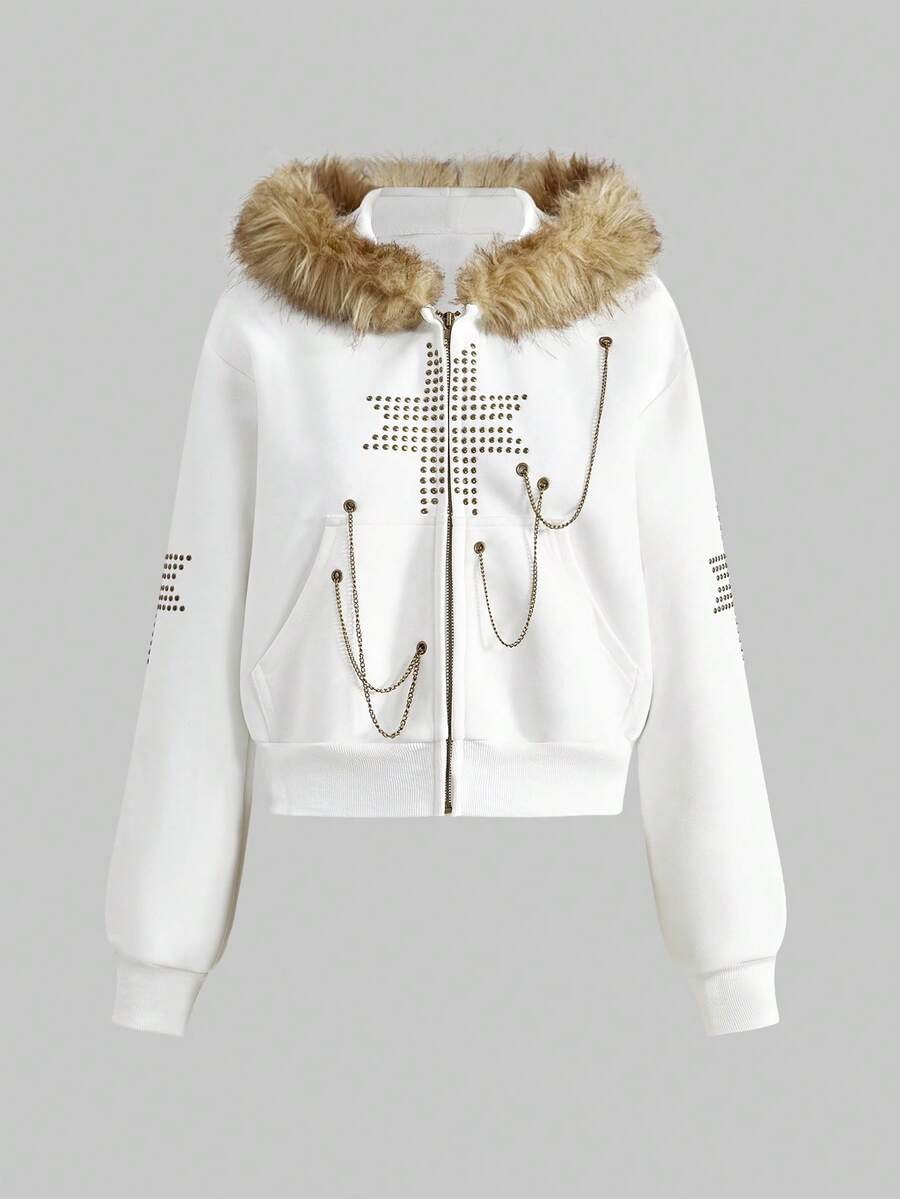 J-Fashion Damen Retro Punk Nieten Ösen Kette Fellimitat Patchwork Kapuzenpullover