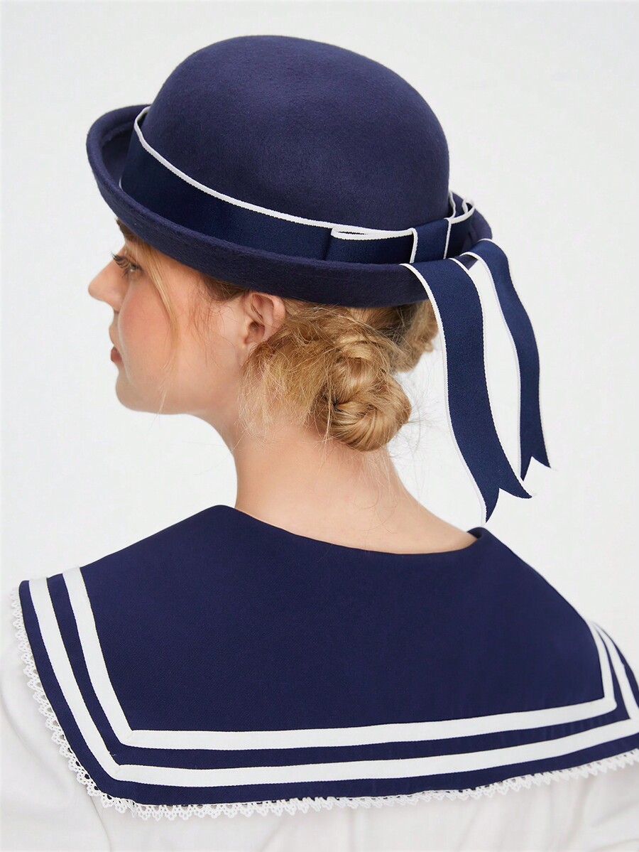 J-Fashion Wollenes Damenkleid Hut im College-Stil mit Schleifendekor