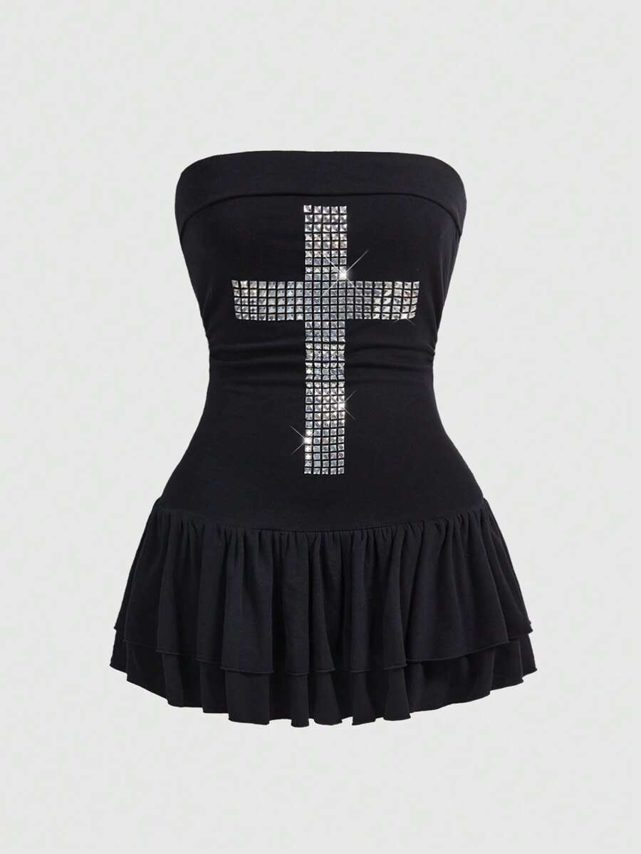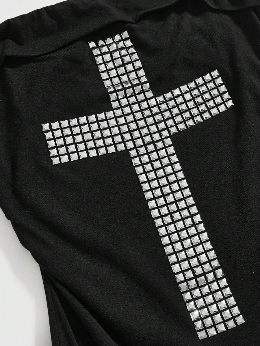 J-Fashion Y2K-Stil kurzes Trägerkleid in Schwarz mit Kreuz-Nieten und Strass-Verzierungen