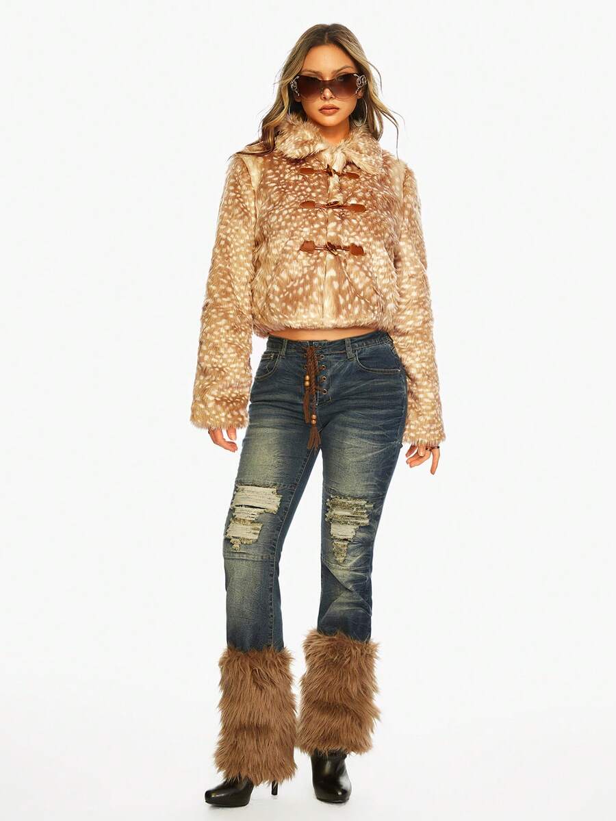 J-Fashion Y2K Vintage Harajuku Reh Kunstpelzmantel mit Hornknöpfen, Regular Fit Damen Oberbekleidung, geeignet für den Winter