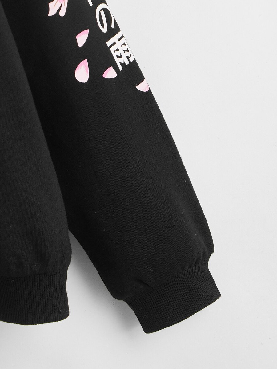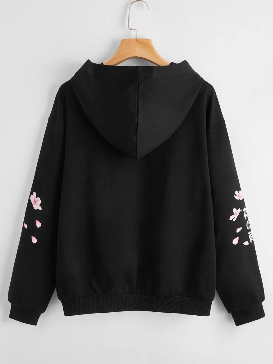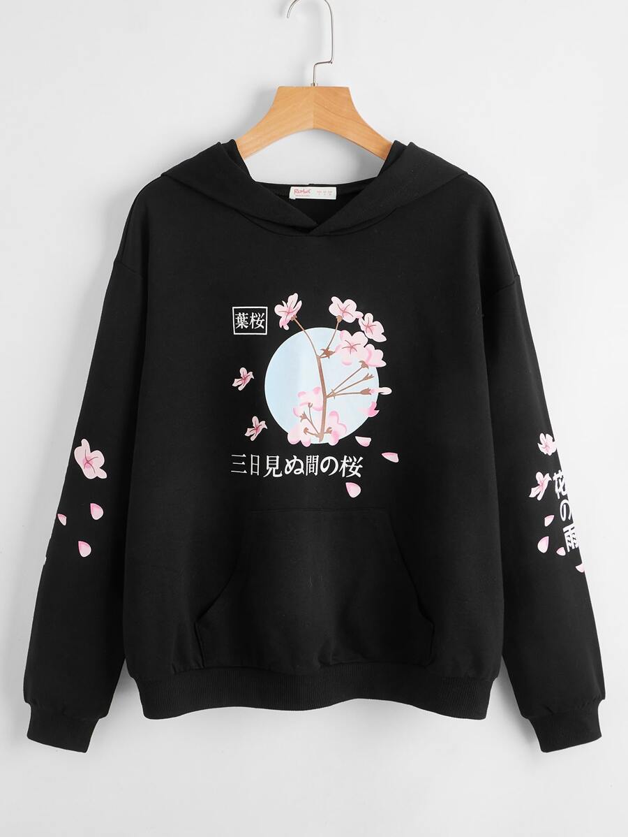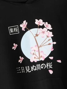 Hoodie mit japanischen Schriftzeichen und Blumen Grafik