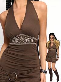 Hippie Sexy Sommerurlaub Träger Schleife Bindeband Besticktes Blumen Tief Ausgeschnittenes Kaffeefarben Damen Mini Kleid