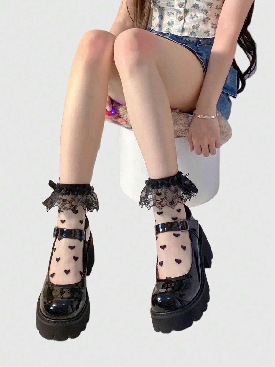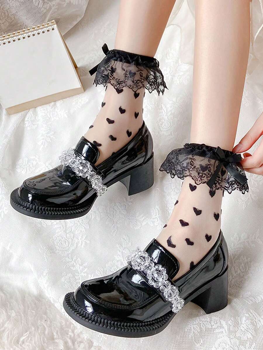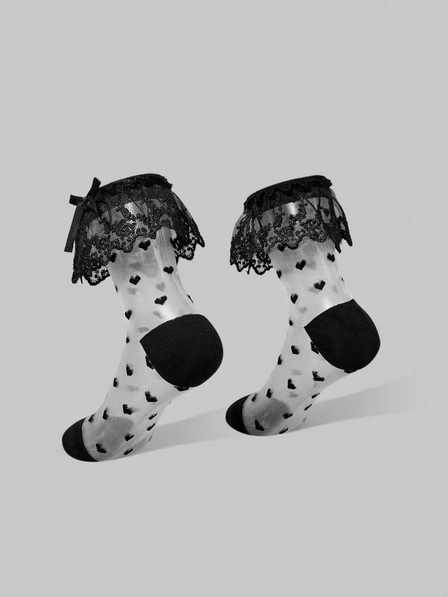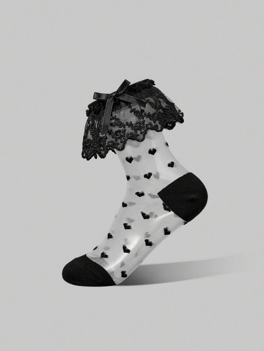 Kawaii 1 Paar süße Spitzensocken, Lolita-Stil schwarze Herz Kniestrümpfe, süße Tüllstrümpfe für Frauen, Sommer
