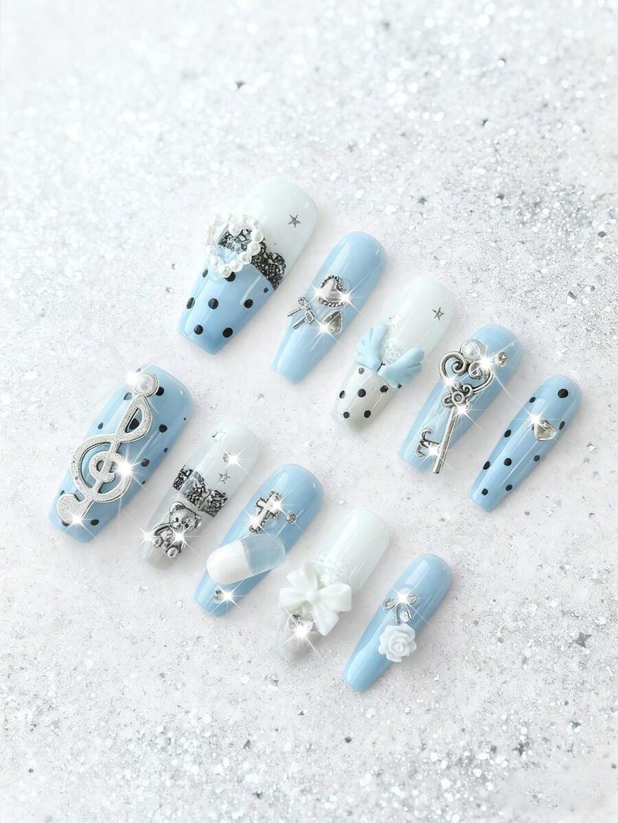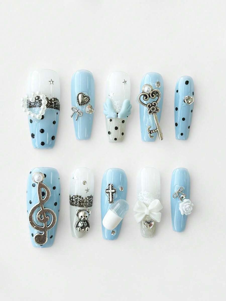 Kawaii 10 Stück süße Flügel, Musiknote, Stern Spitzenrand Polka Punkt handbemalte hochwertige Kunstnägel + 3 Stück doppelseitiger Kleber, abnehmbare & wiederverwendbare Sarg-förmige Fake Nägel, Schleife Element Nagel Aufkleber, geeignet für Feiertage, Partys, Tanzen und den täglichen Gebrauch