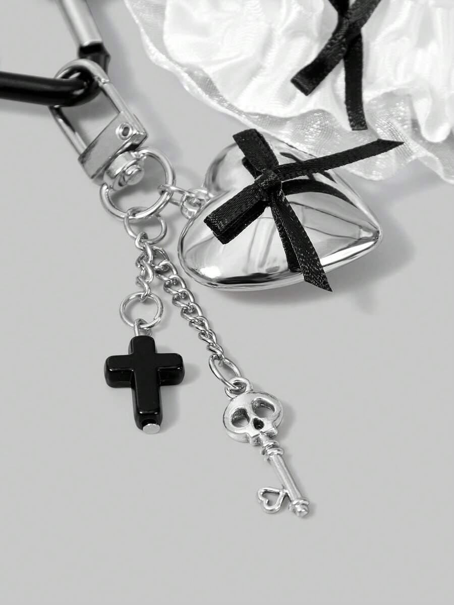 Kawaii 1 Stück Schlüsselanhänger mit schwarzer & weißer Spitzen-Schleife, Perlen, Herz und Y2K-Ästhetik für die Tasche