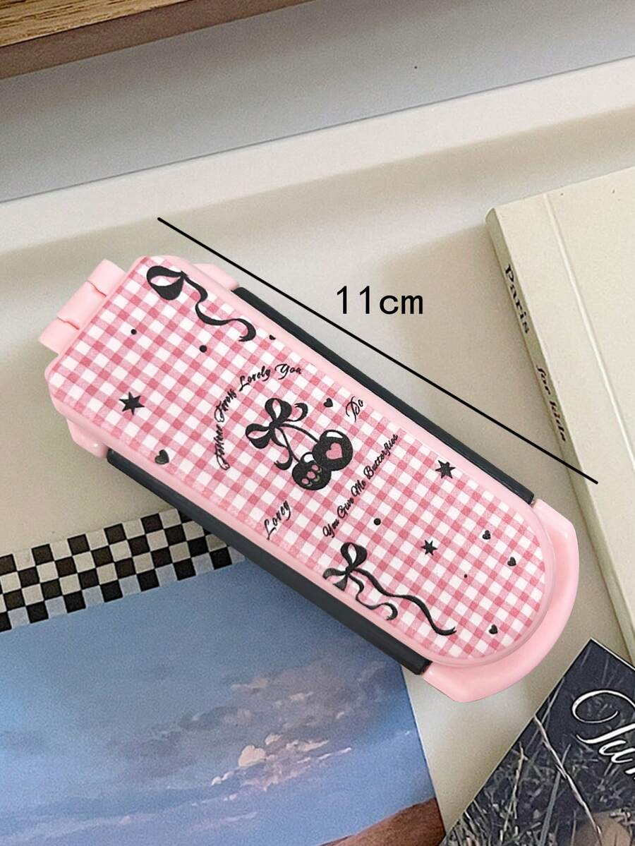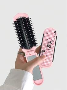 Kawaii 1 Stück karierter Rücken-zu-Schule Klappbürste mit Spiegel, tragbare Haarbürste mit Schleifen-Dekor