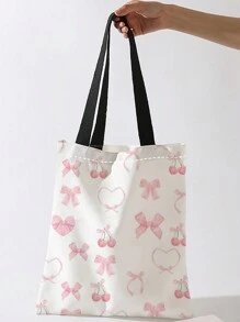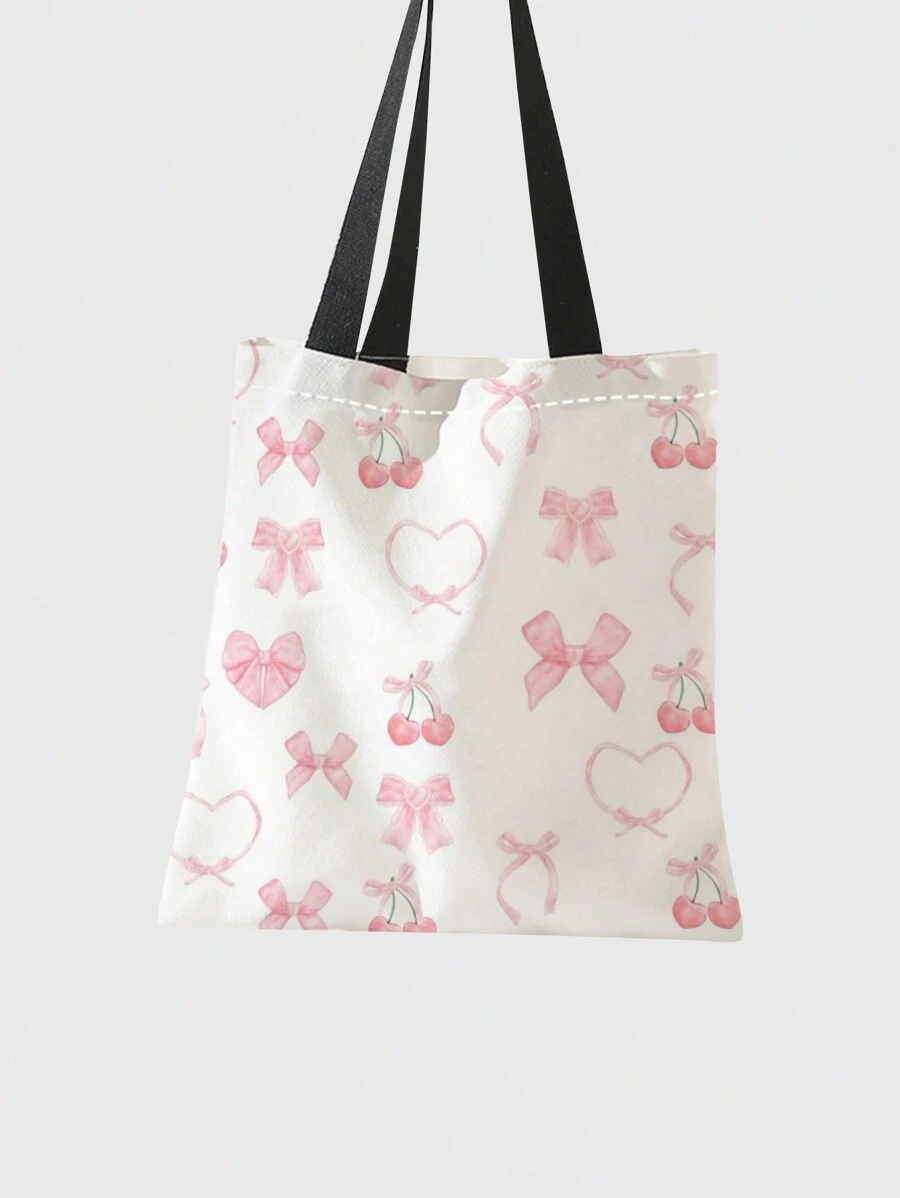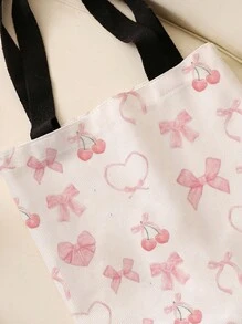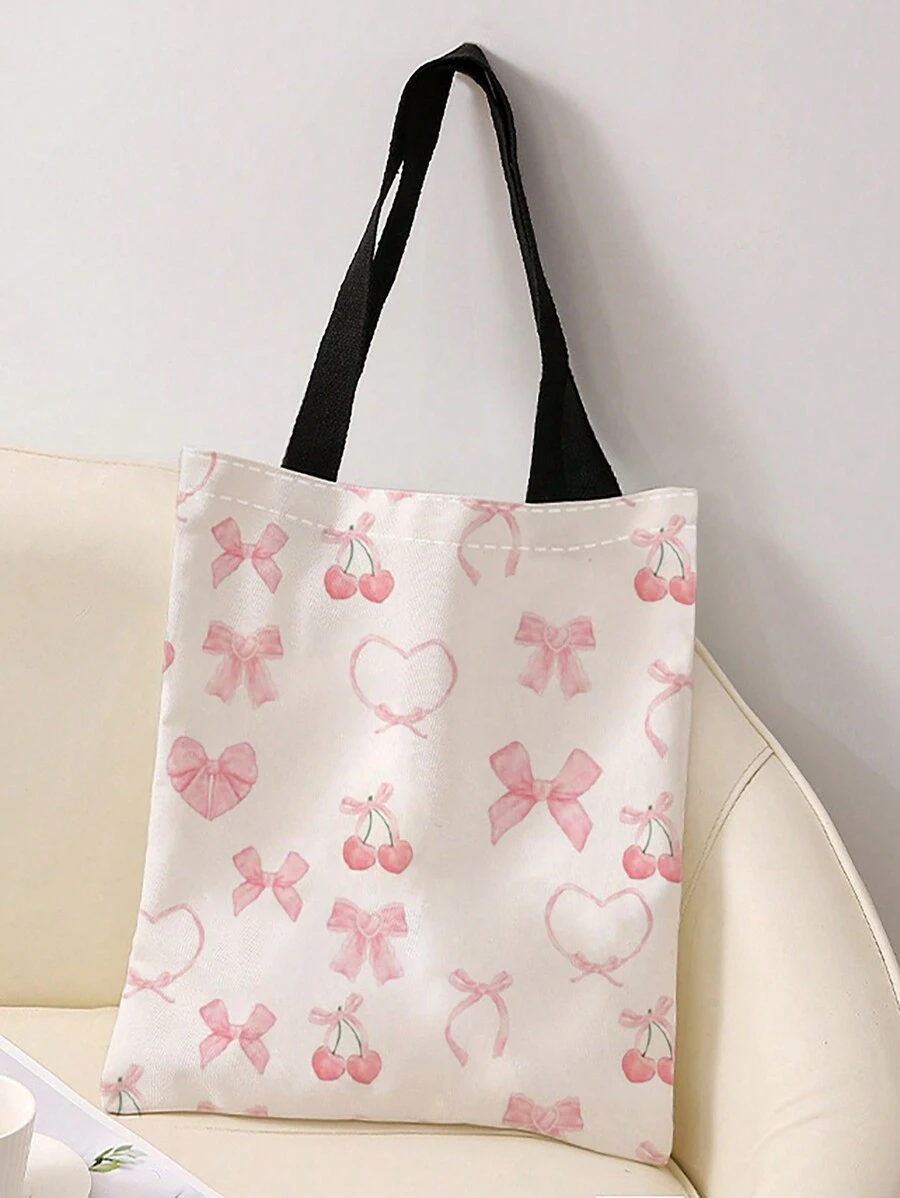 Kawaii 1 Stück süße Frauentasche mit Schleife und Kirsch Muster, modische Segeltuch Schultertasche, Einkaufstasche, Studenten Buch Tasche