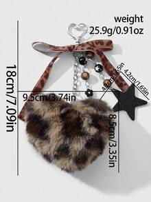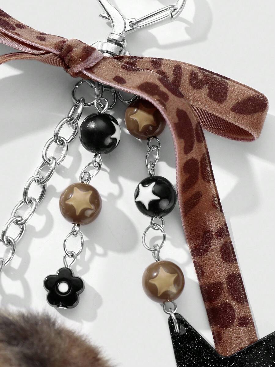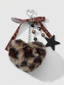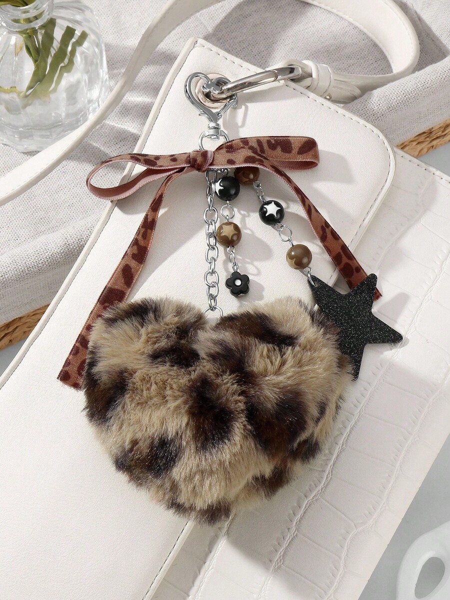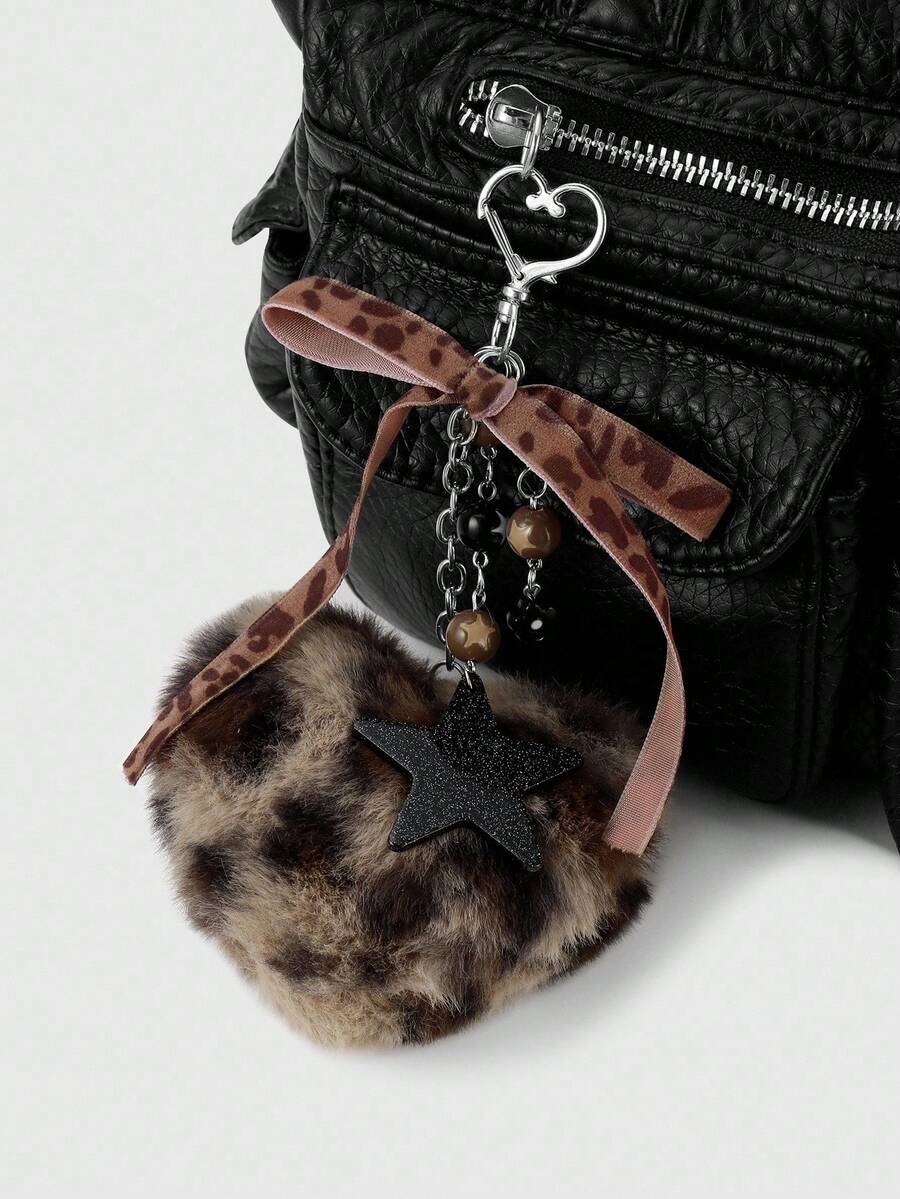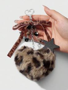 Kawaii 1 Stück modischer, retro personalisierter Acryl-Stern-Blumen-Schlüsselanhänger mit braunem Kunstfell-Leopardenmuster und Herz-Schleife, geeignet für Frauen, Alltagsmode, Urlaubsgeschenk