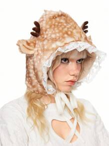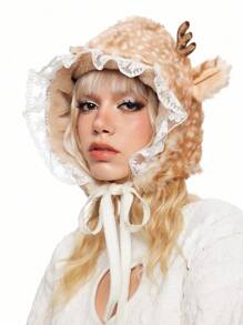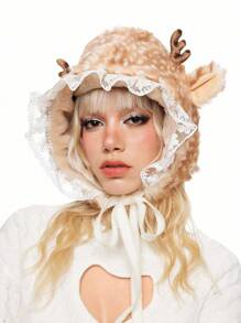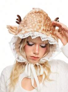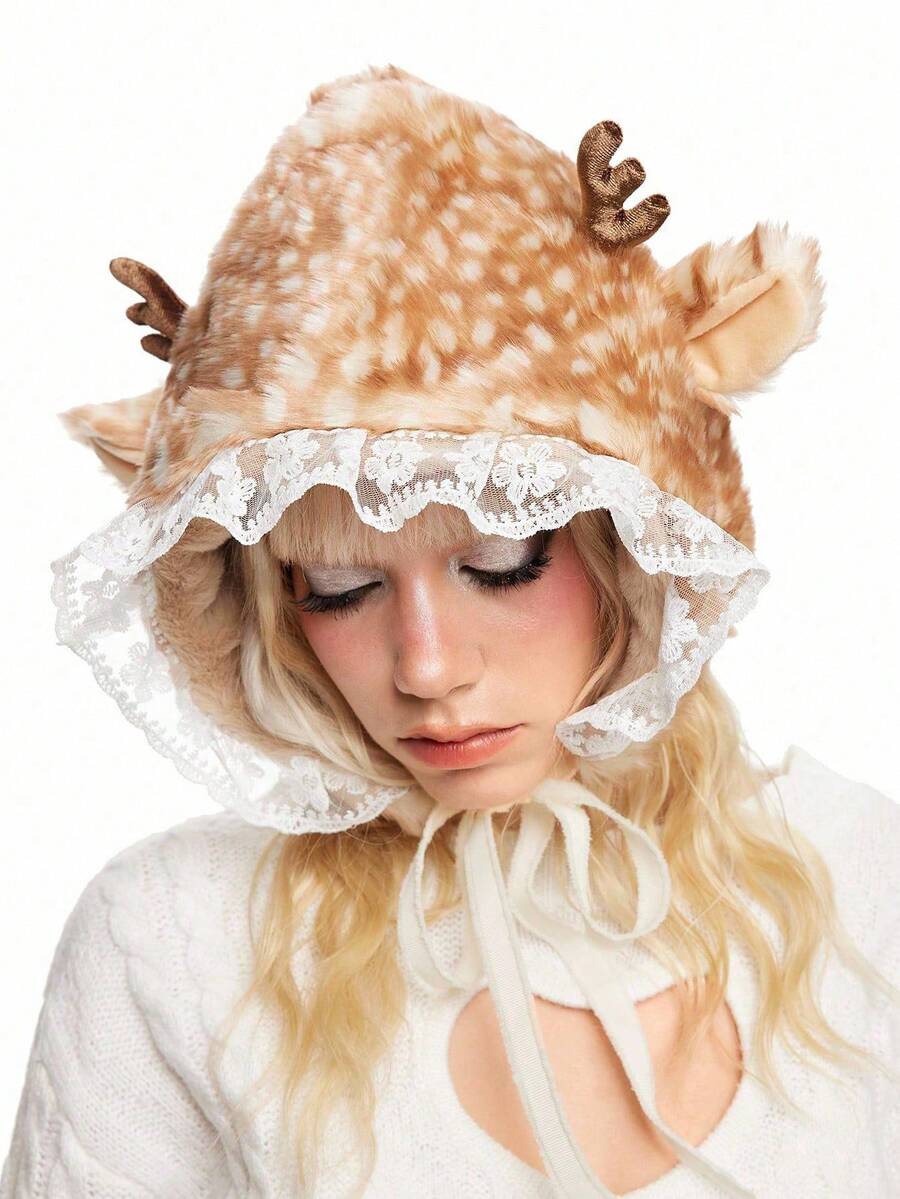 Kawaii 1 Stück Mori-Mädchen-Stil Plüsch Kunstfell Niedlicher Spitzen-Hirsch-Ohrenhut, Spitzen-Saum Niedlicher Hut, Dicker Warmer Ohrenschutz-Hut für den Winter