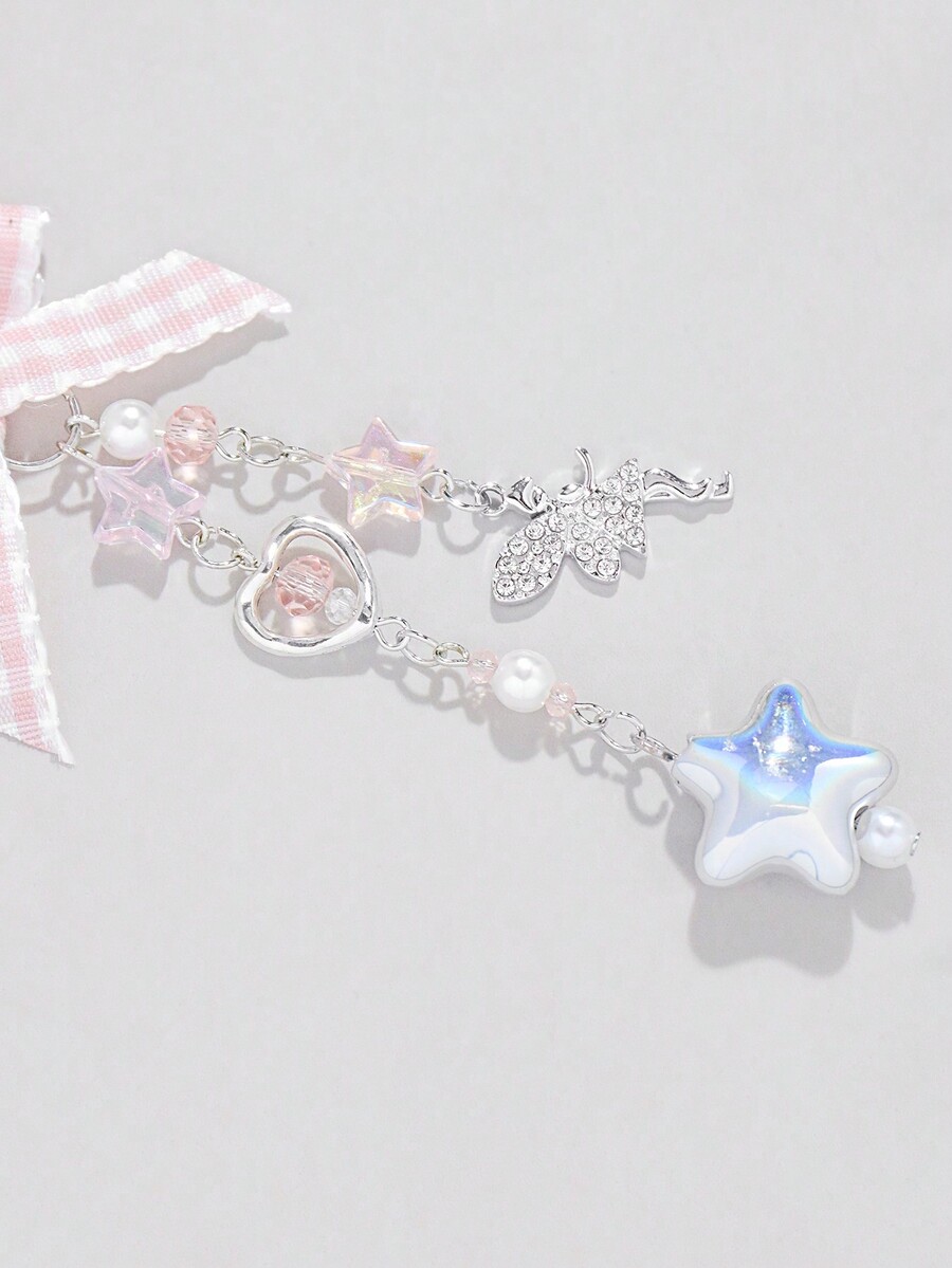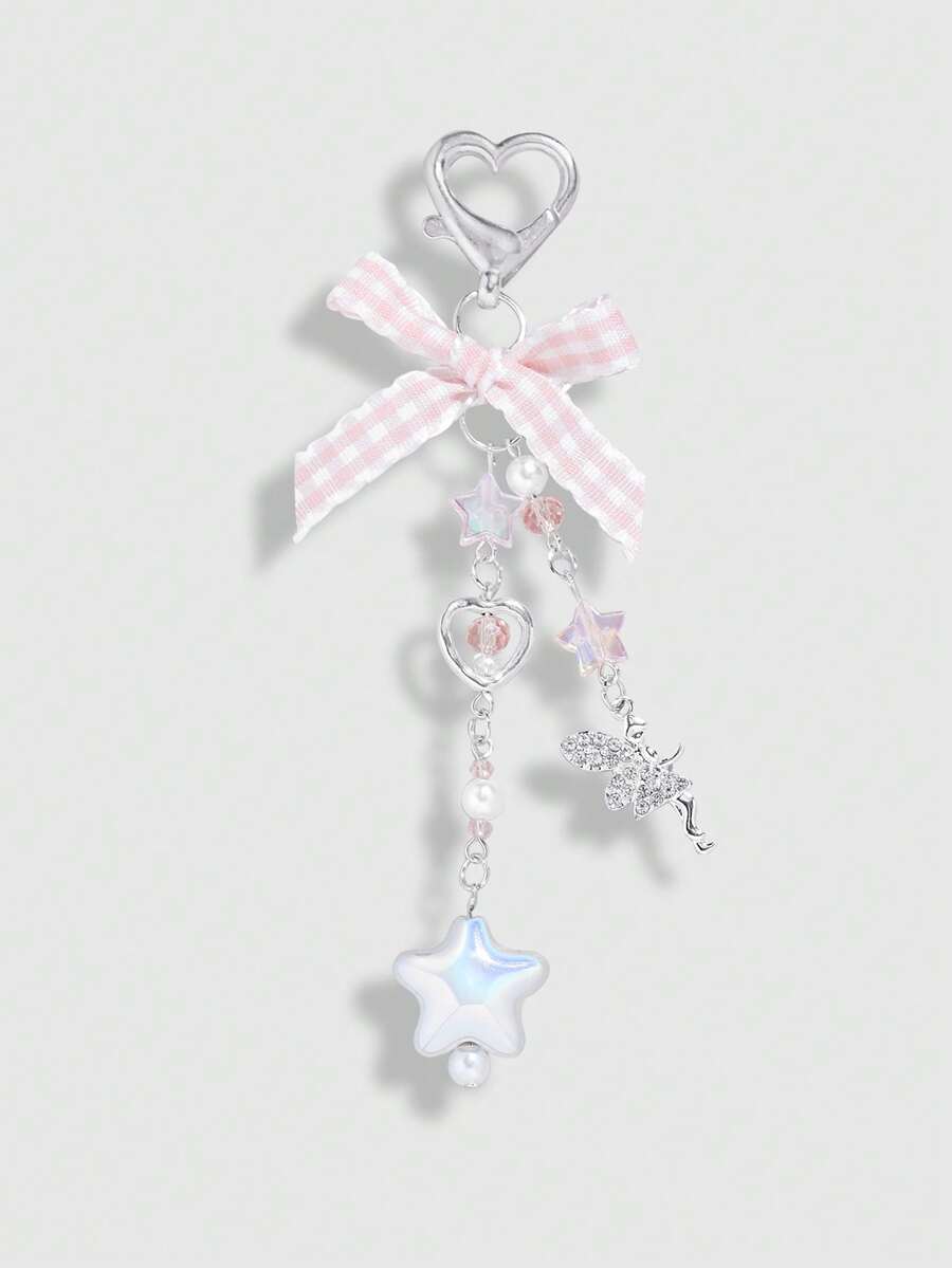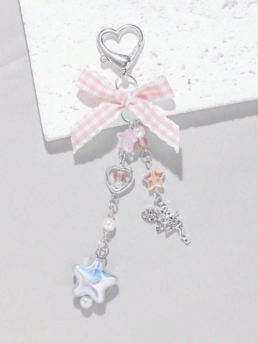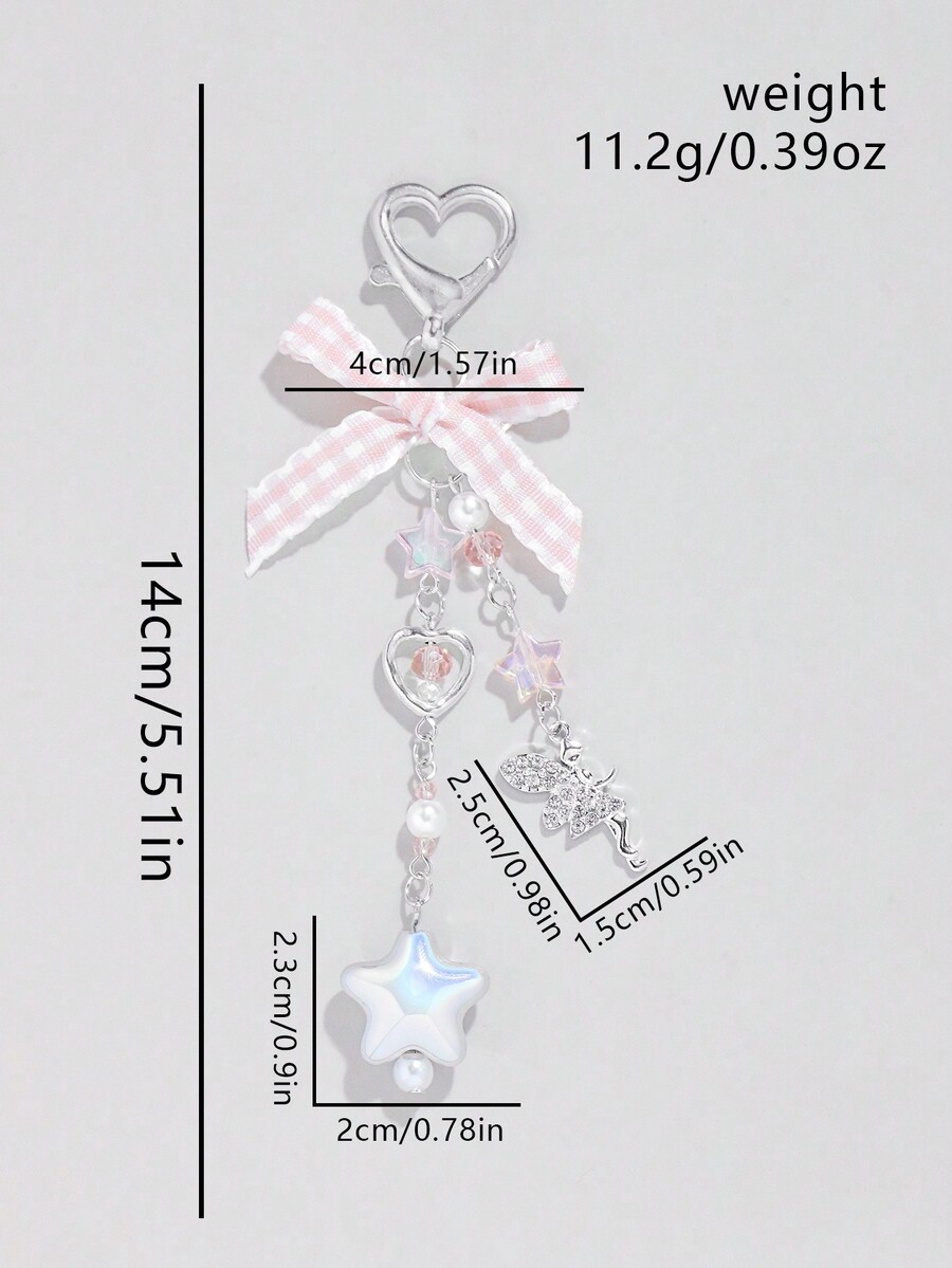Kawaii 1 Stück süßer und lieblicher Schlülerinnen-Stil, rosa karierte, gewebte Schleife, Kristall Stern Herzperle Anhänger Schlüsselanhänger Taschenanhänger, geeignet für die tägliche Dekoration von Frauen und Studenten und als Festgeschenke