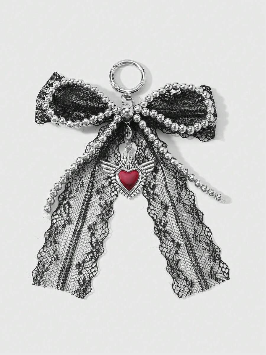 Kawaii 1 Stück Y2K süßer Gothic Stil handgemachter Schlüsselanhänger mit Perlen, CCB, schwarzer Spitze, Schleife, Tropföl-Herz- und Pfeil-Anhänger, geeignet für Frauen, Alltagsgebrauch oder als Geschenk, Halloween