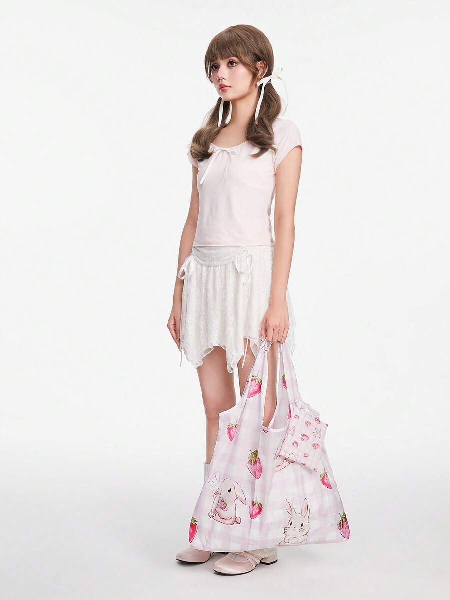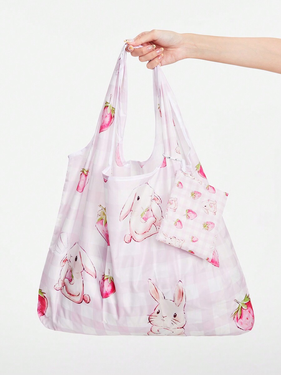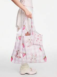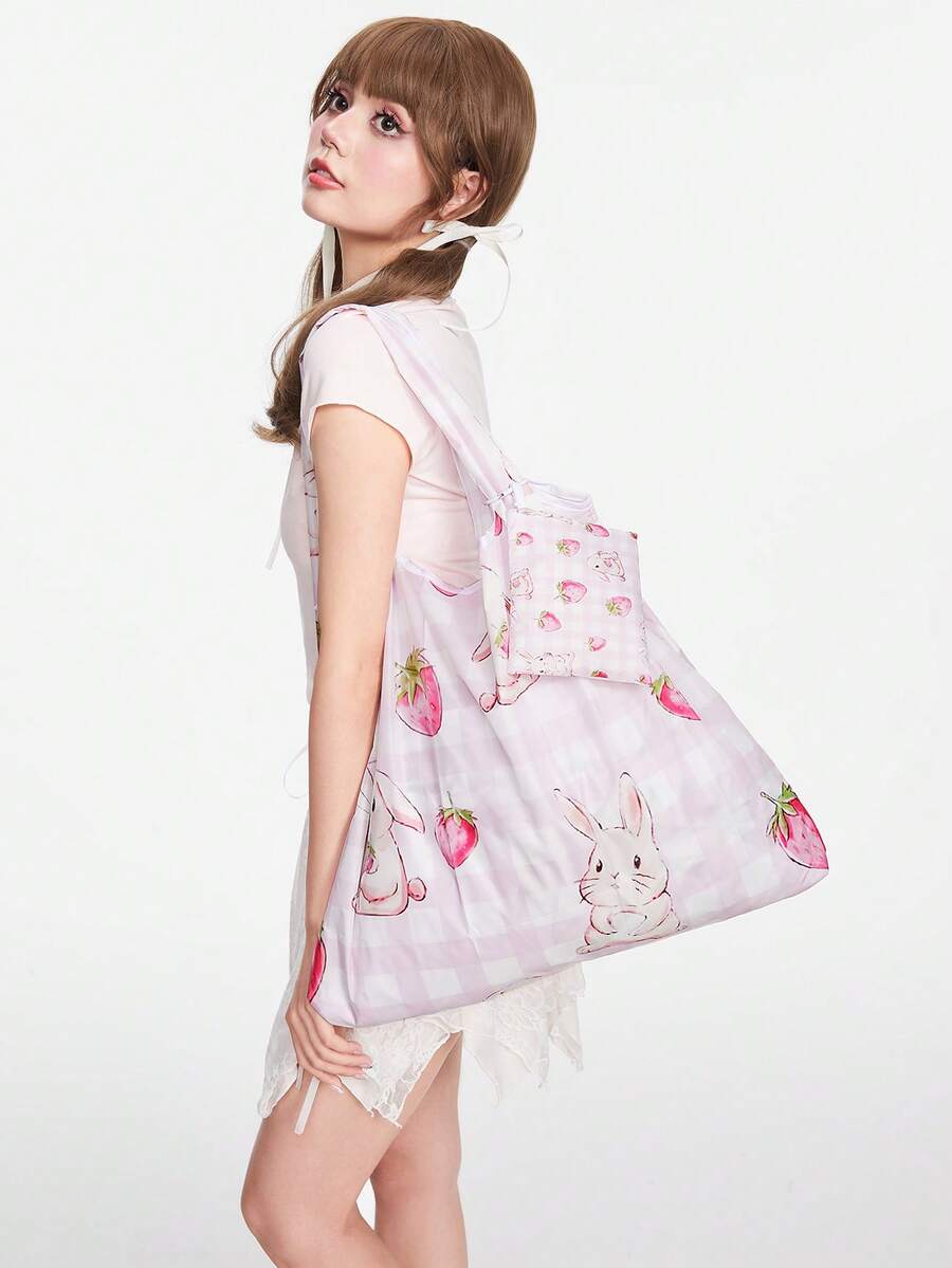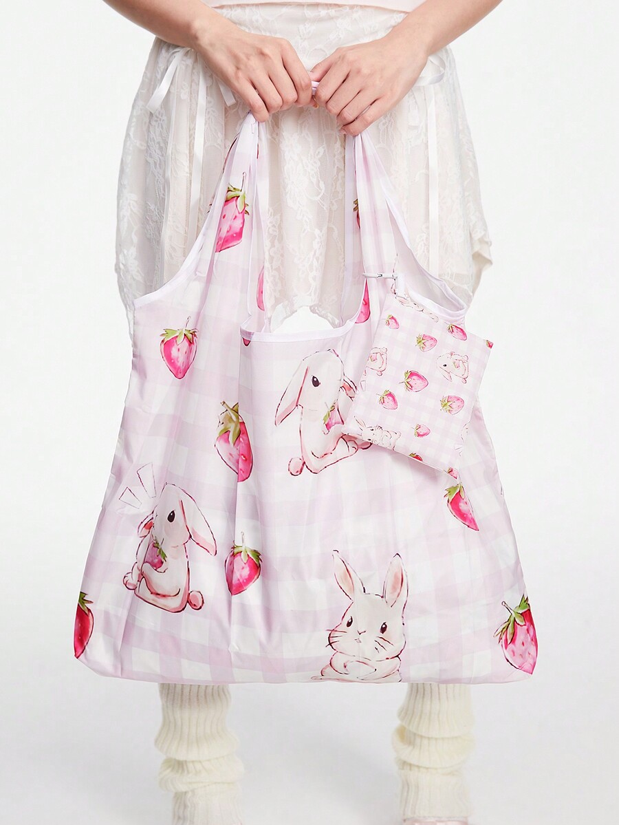Kawaii 2 Stücke/Set Cartoon Pink Plaid Erdbeere Kaninchen Aufbewahrungstasche & Einkaufstasche mit Münzbeutel, große Kapazität & faltbar, #306482