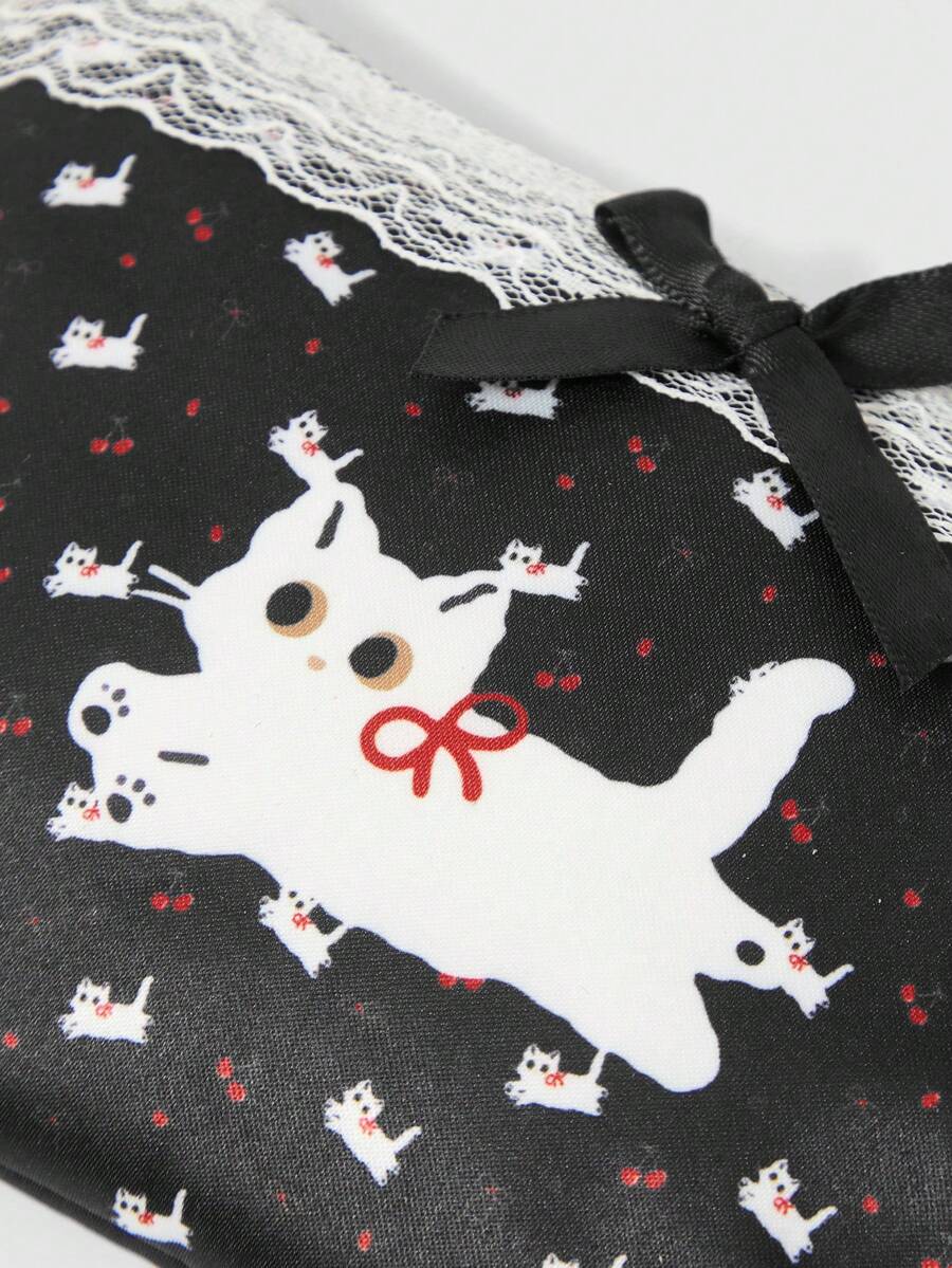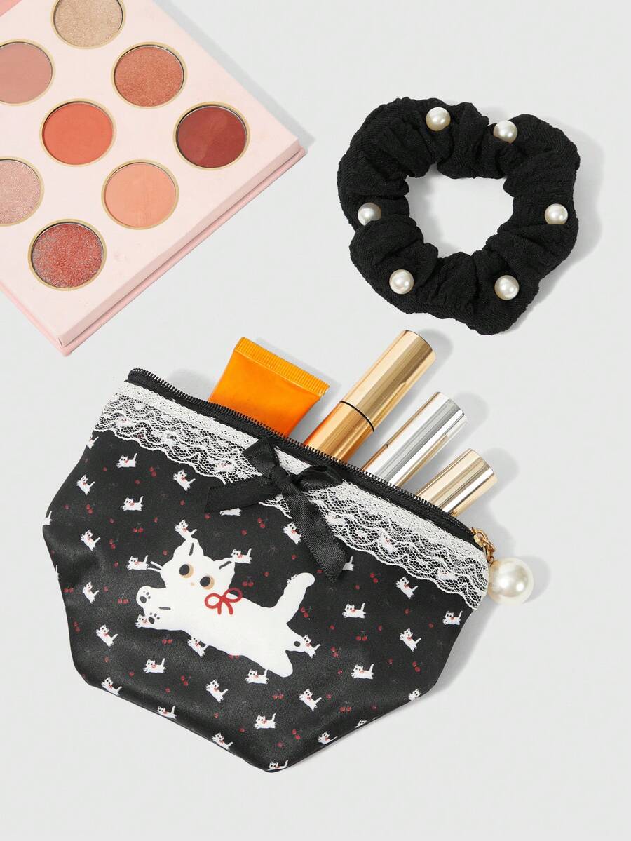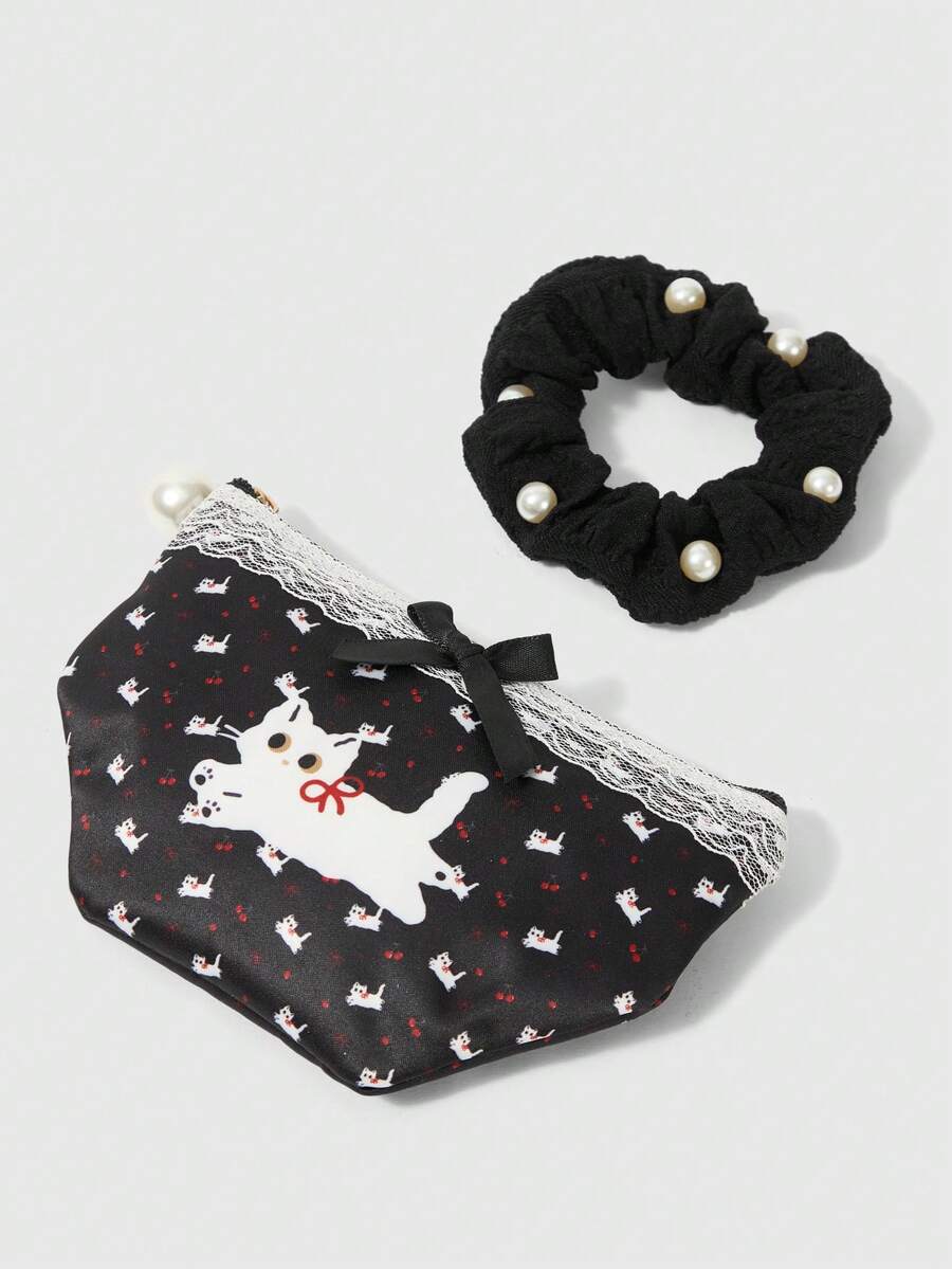 Kawaii 2er Set süßer Geldbeutel/Kosmetiktasche mit Spitzenverzierung, Katzen- und Schleifen-Muster, mit Perlen-Haargummi