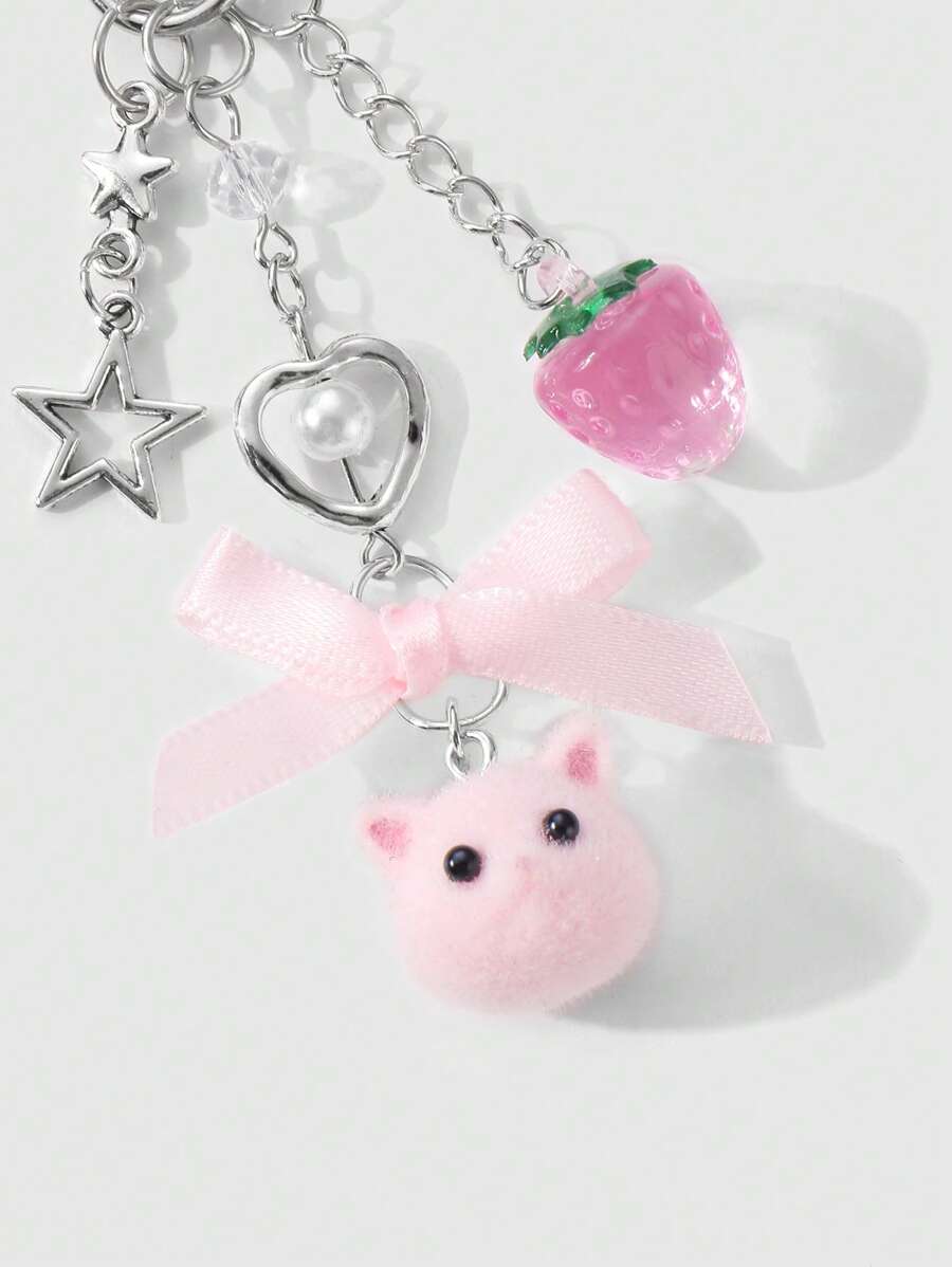 Kawaii 6 Stücke elegantes und süßes Silber-Ketten-Set mit Stern, Erdbeere, Schleife, Samtkatzen-Kopf Anhänger + transparenter Handy-Karten zum Selbstbasteln, ideal als Geschenk für Schwestern, Freundinnen, Paare für den Alltag oder Feiertage