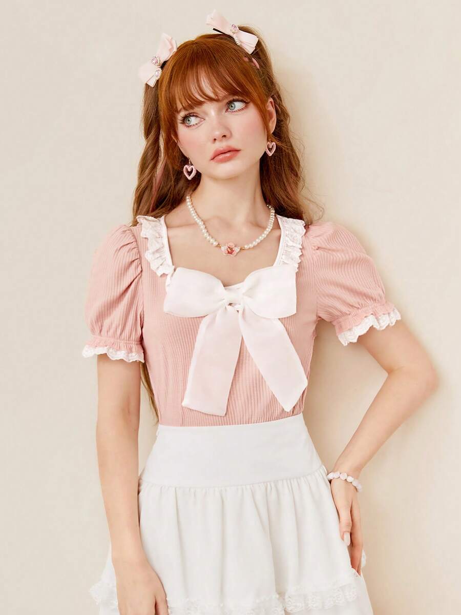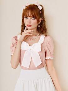 Kawaii T-Shirt mit Schleife vorne, Puffärmeln,