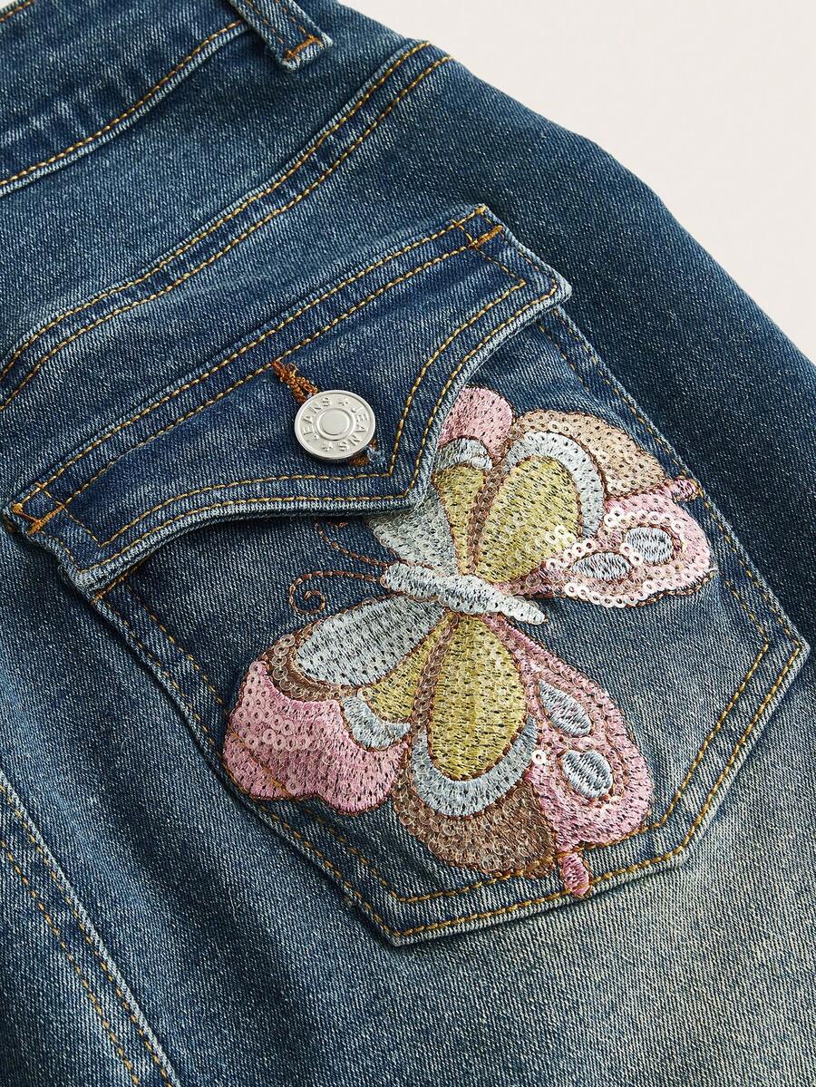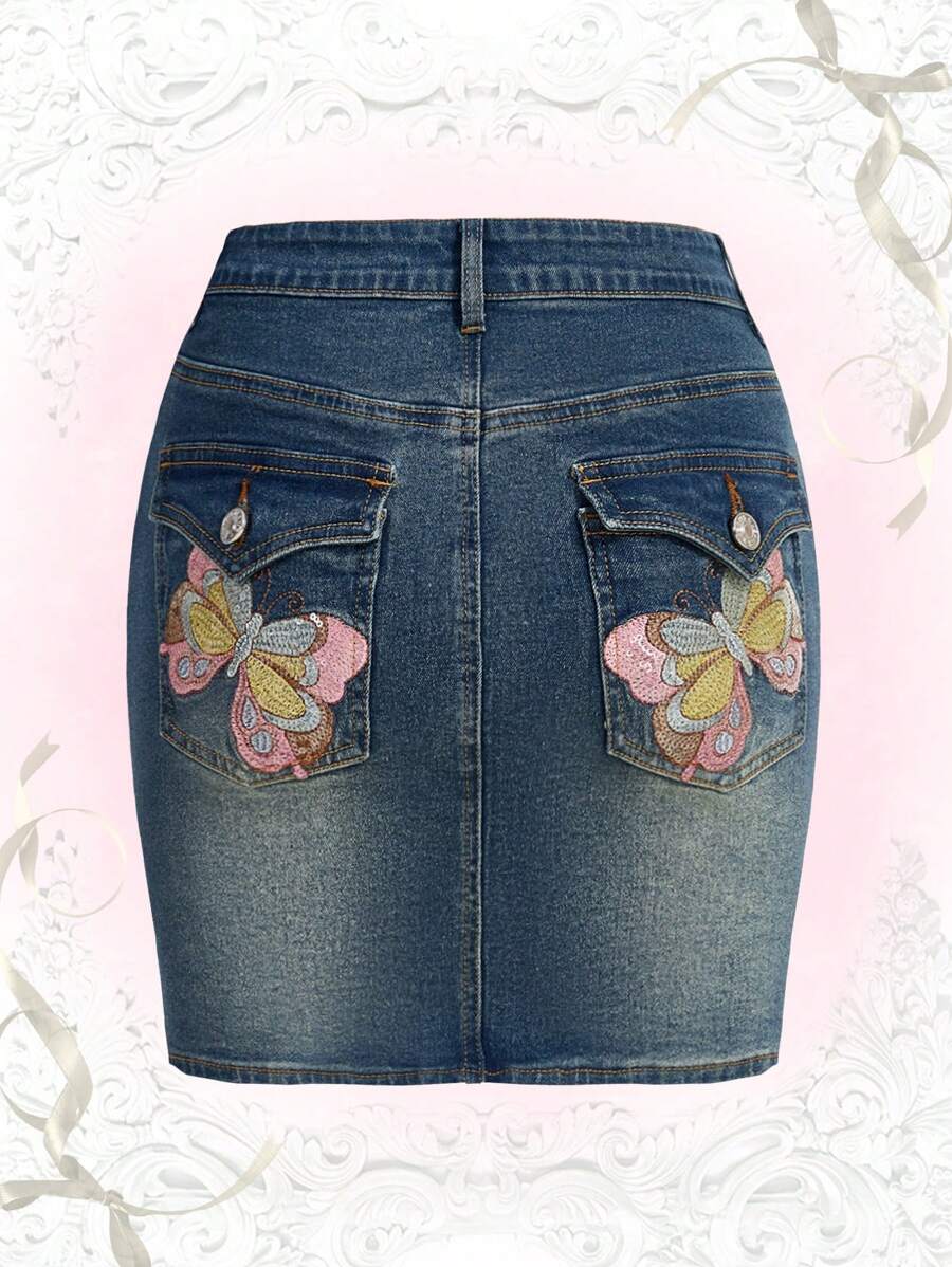 Kawaii Jeansrock mit Schmetterling Stickerei, Pattentasche,