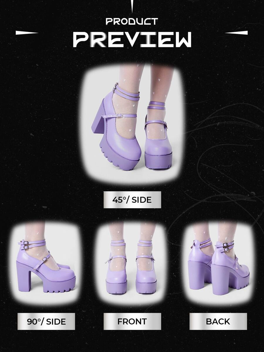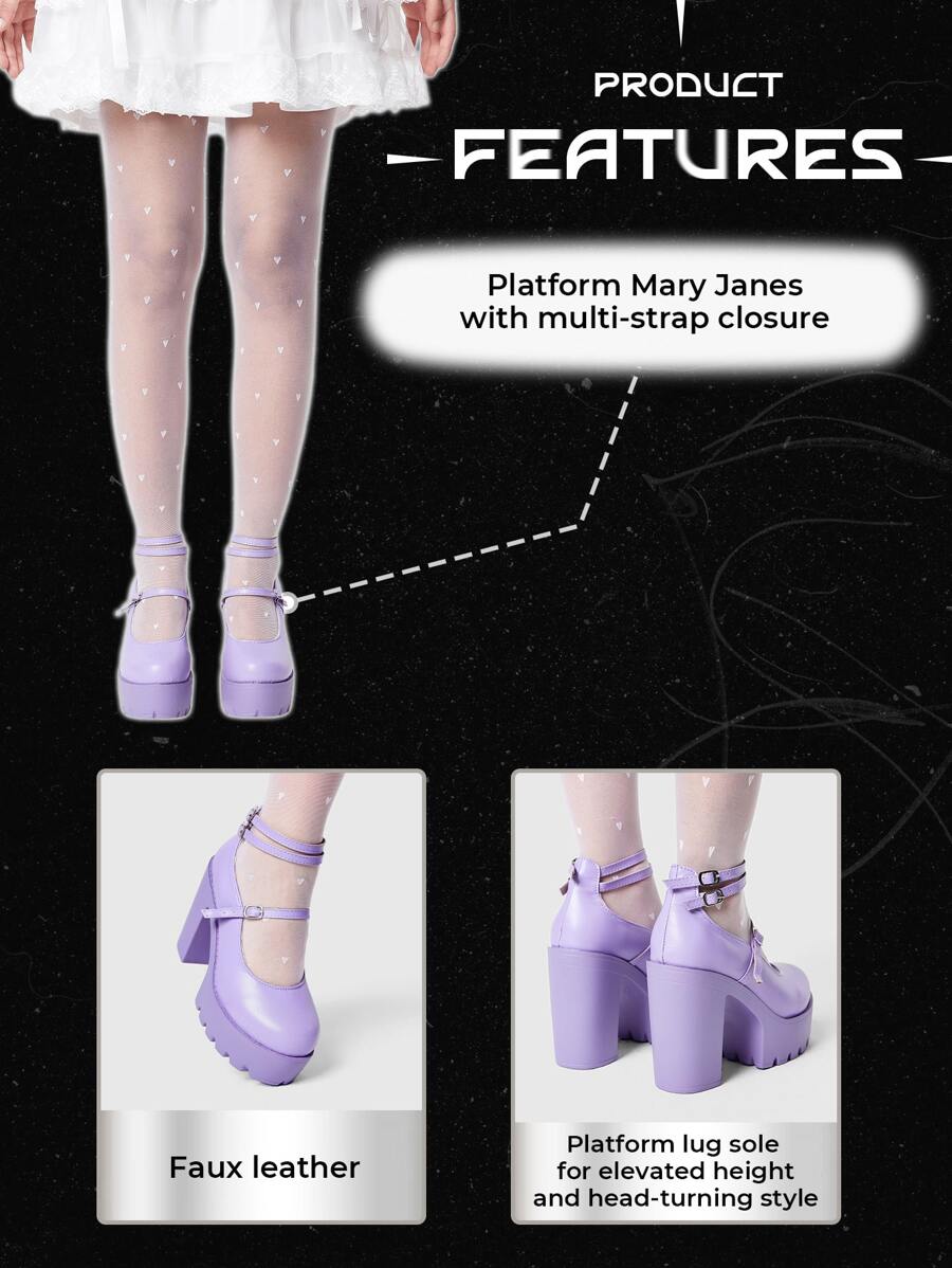 Kawaii Geschlossene lila High Heels, Mary Jane Schuhe mit dickem Absatz und wasserfester Plattform, mit mehreren Schnallen verzierte Party-Pumps für Frauen zum Valentinstag