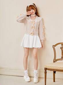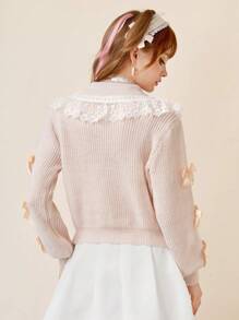 Kawaii Cardigan mit Kontrast Spitzen, Schleife vorne, Zopfstrick