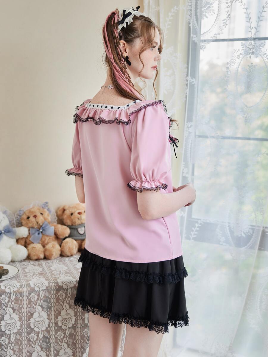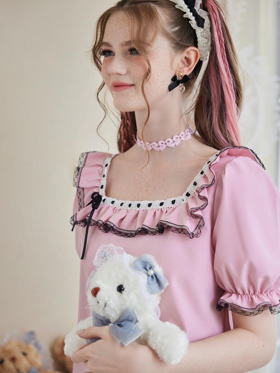Kawaii Bluse mit Kontrast Spitzen, Puffärmeln