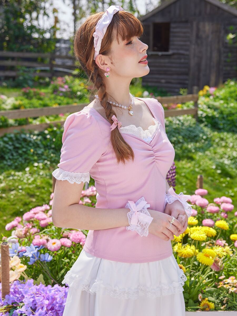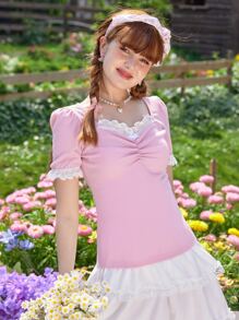 Kawaii Schleifen Durchsichtige Spitze Gerüscht Rippenstrick Einfarbig Lässig Damen T-Shirts