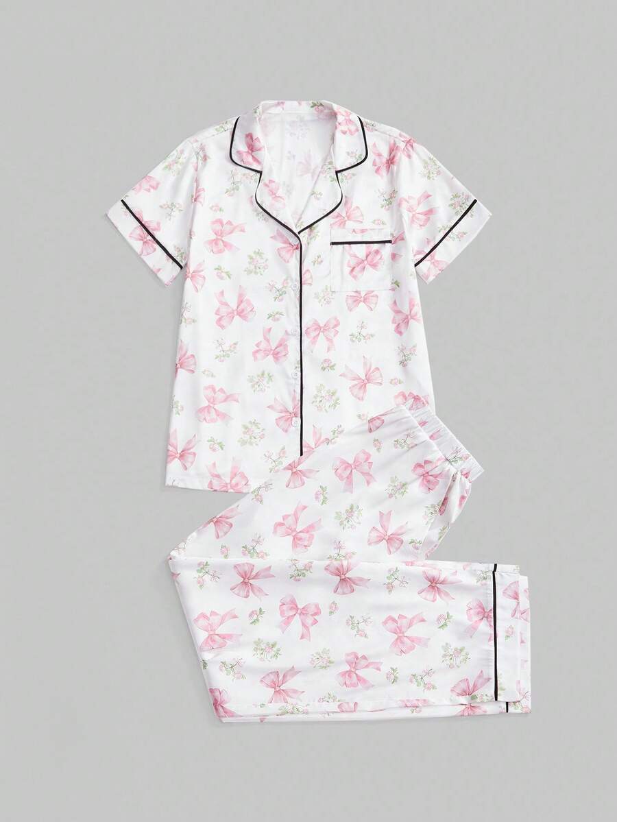 Kawaii Süßes Schleife Blumen Muster Satin Stoff Langarm Shorts Damen Pyjama Set