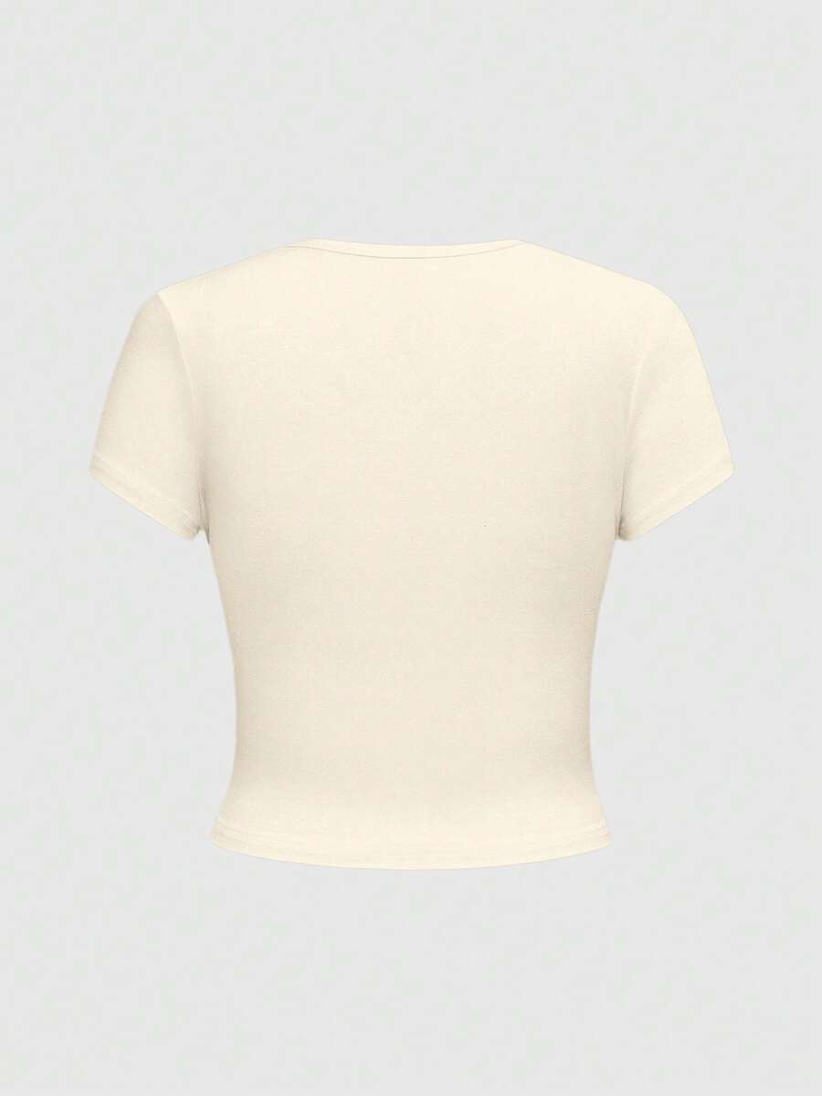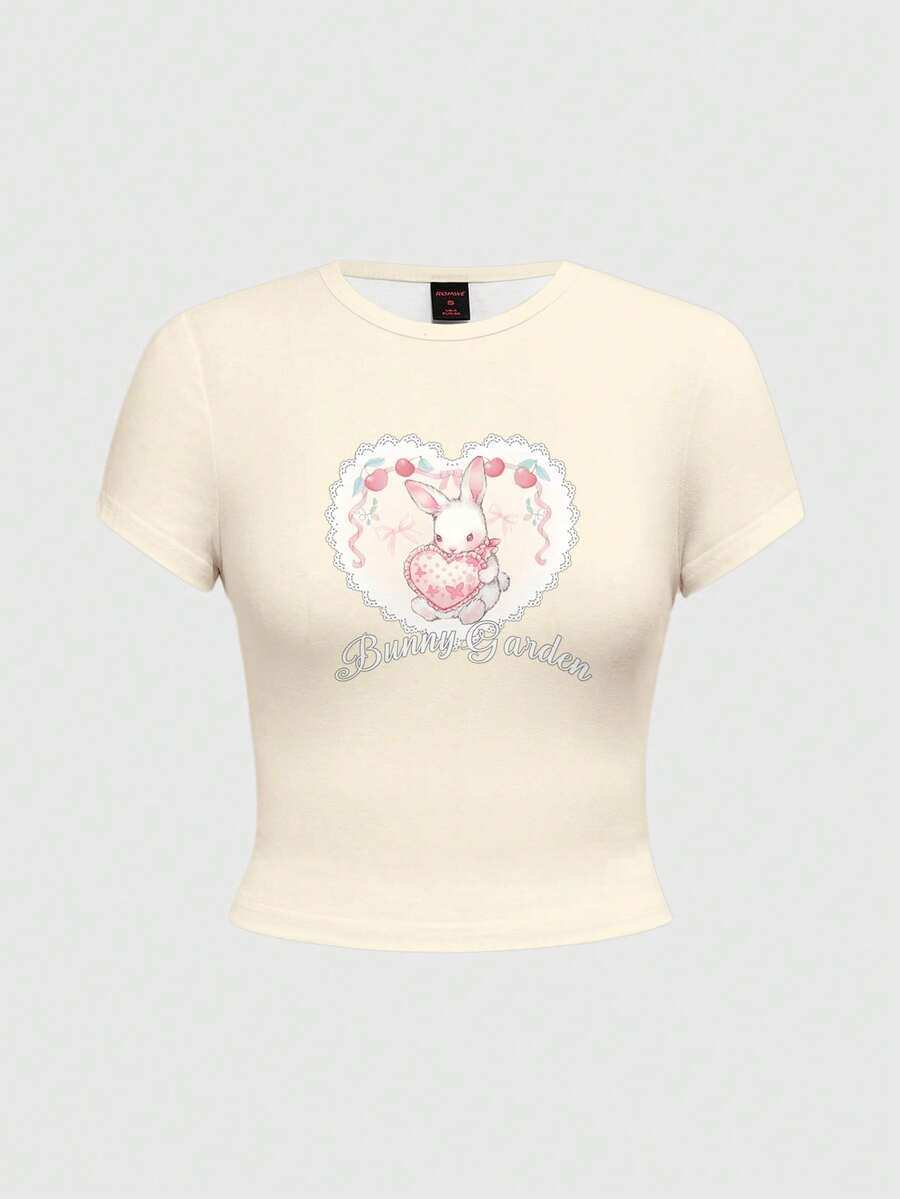 Kawaii Süßes Collegemode Unschuldiges Herz Kaninchen Slogan Schleifen Spitze Allover-Muster Sexy Damen T-Shirt