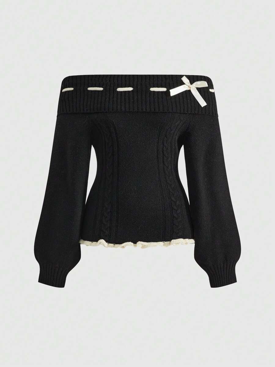 Kawaii Süßer & sanfter Damen Pullover, Off-Shoulder, Schleife und Passform