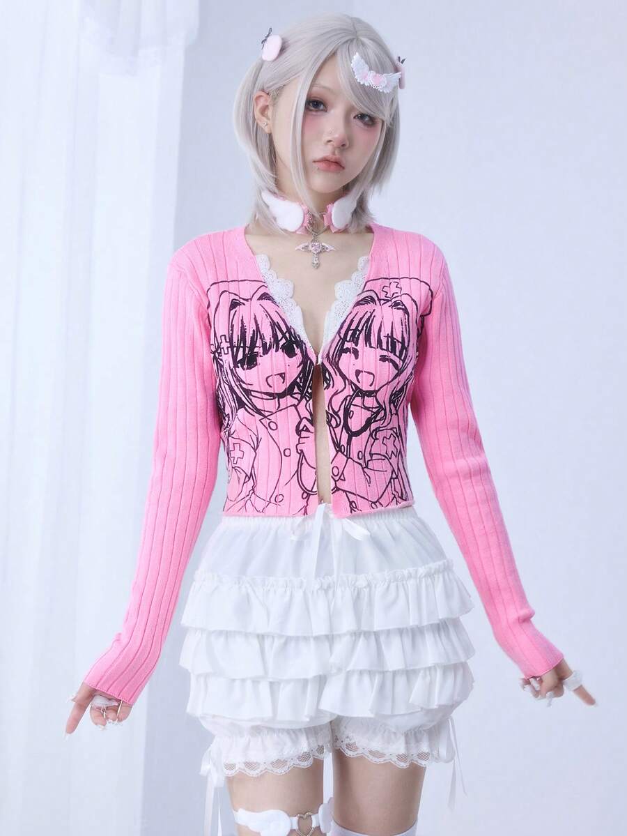 Kawaii süßer rosa Anime-Mädchen-Muster Kontrast-Spitzen-Damen-Pullover
