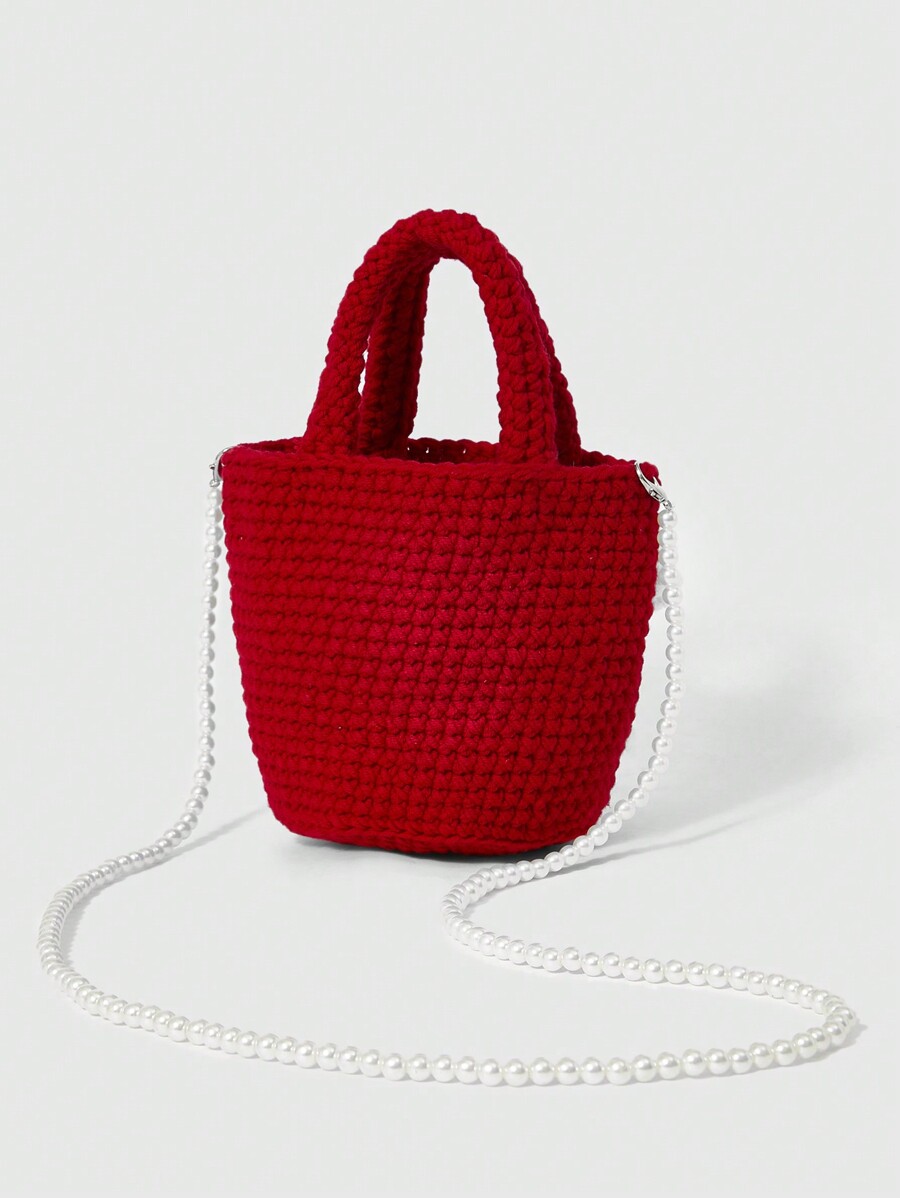 Kawaii Rot & Weiß Farbblockbeutel mit niedlicher Schleife, gestrickt für Schulter/Umhängetasche, Valentinstag