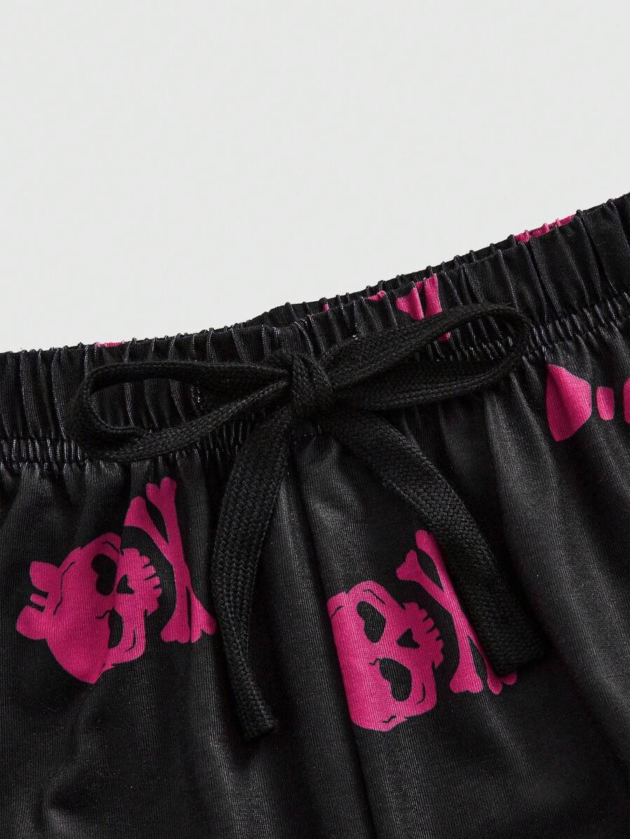 Kawaii Cami Top mit Spitzenkante und Schädel Muster, Hose, lässiger Pyjama Set, Schule
