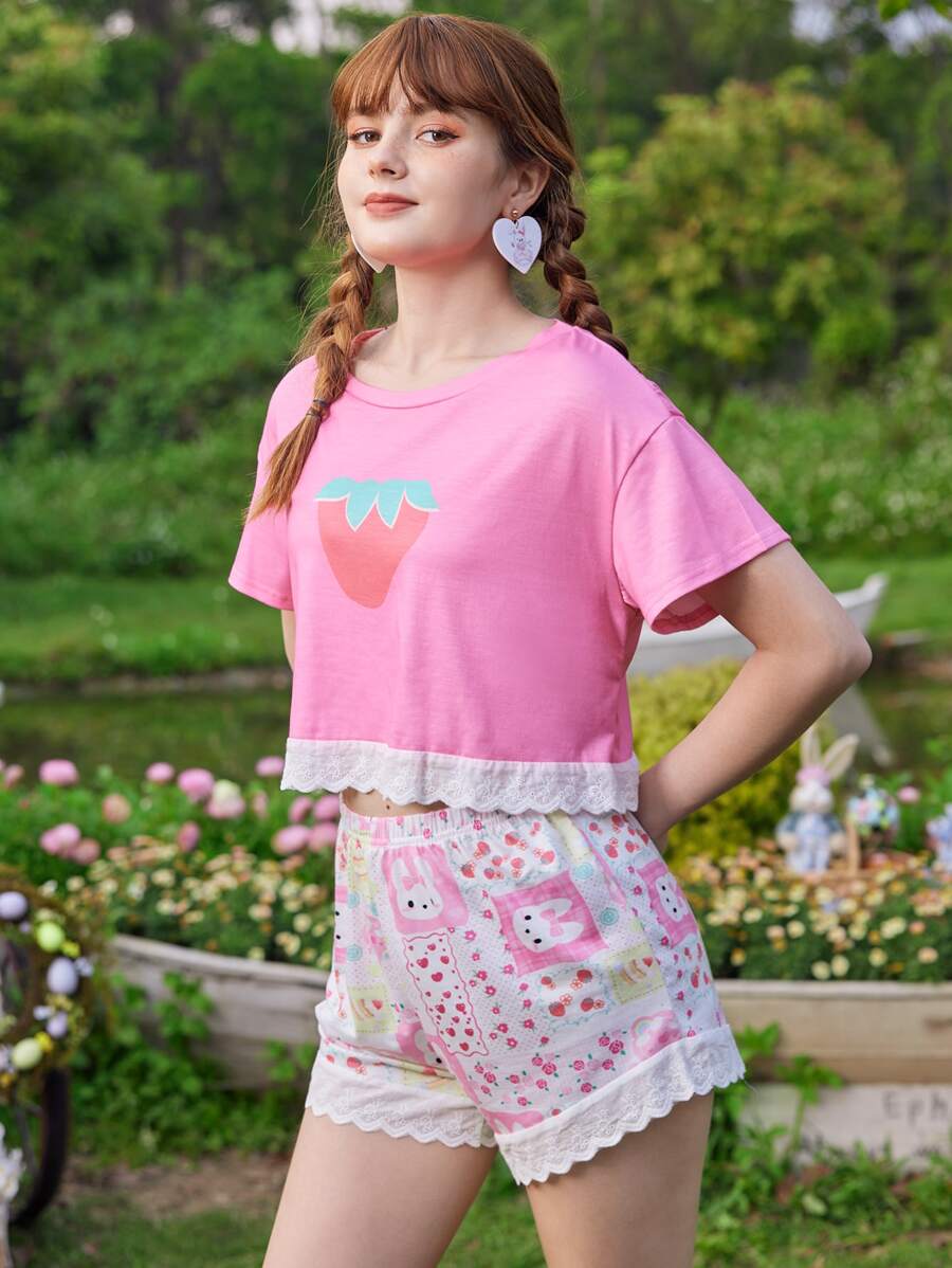 Kawaii Pyjama Set mit Erdbeere & Hase Muster, Kontrast Spitzen,